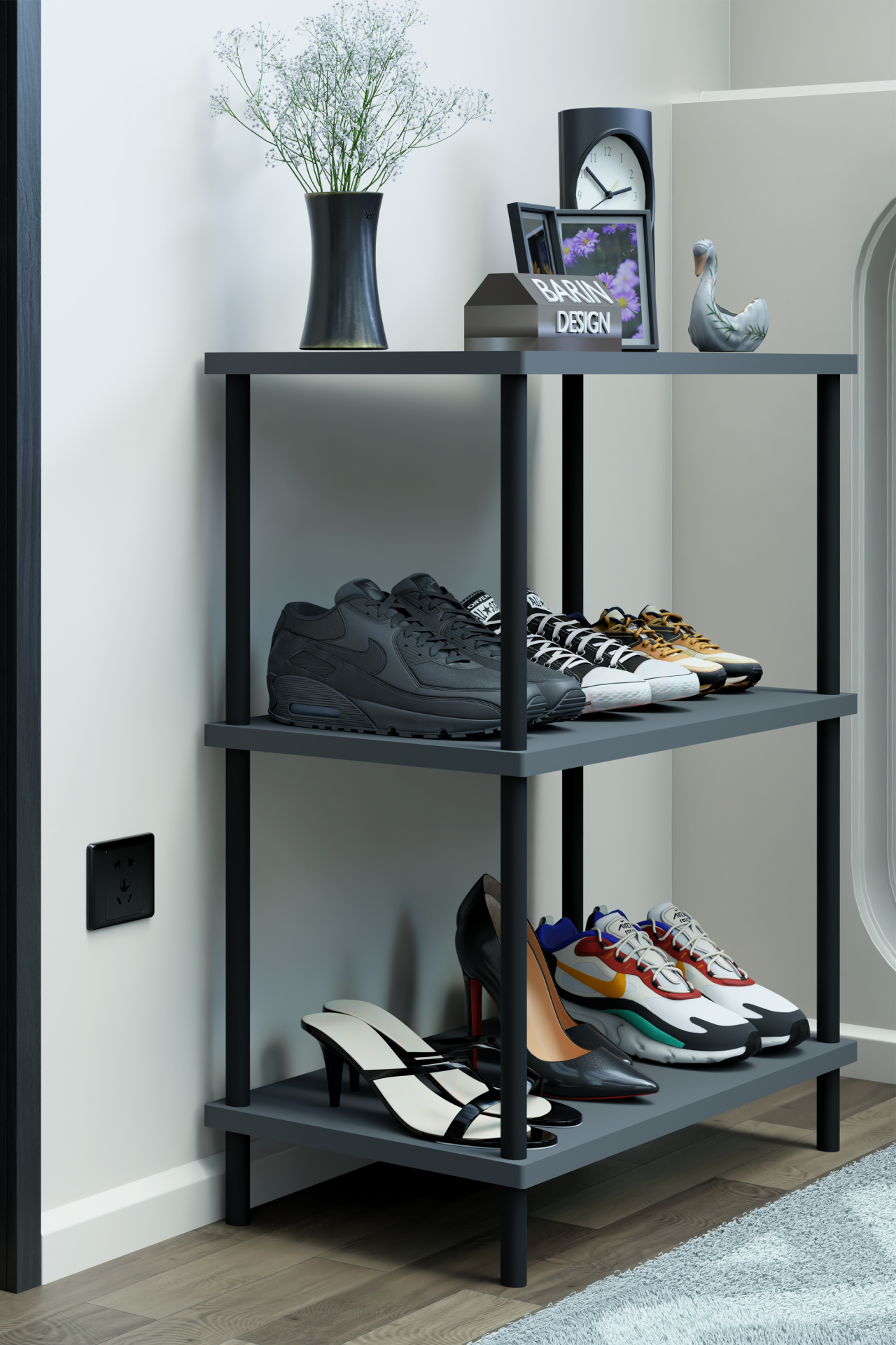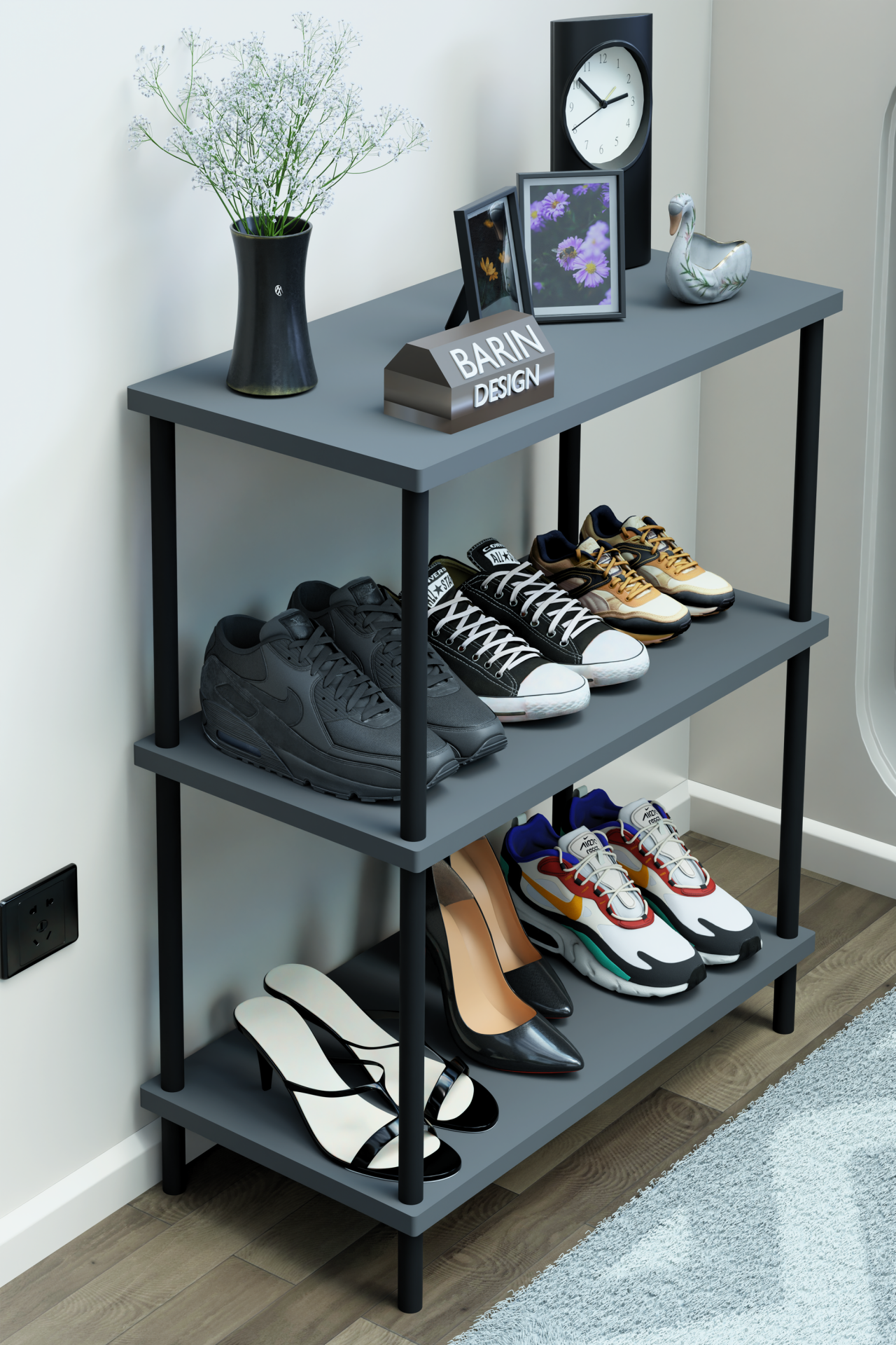 3 Katlı Ayakkabılık Raf - Çevir Tak Sistemli | Kolay Kurulum | Metal Gövde | Ahşap Raflı Organizer Antrasit
