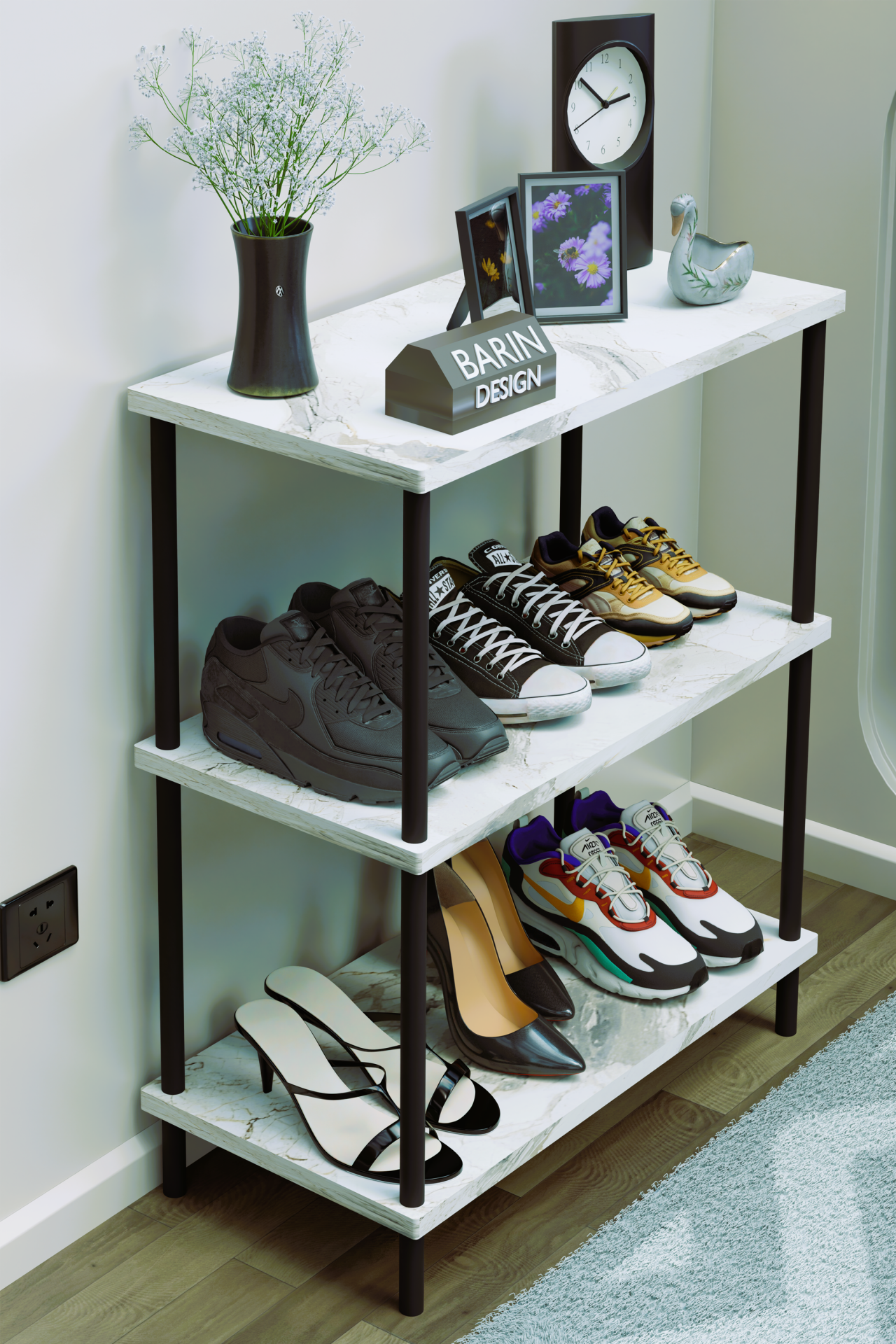 3 Katlı Ayakkabılık Raf - Çevir Tak Sistemli | Kolay Kurulum | Metal Gövde | Ahşap Raflı Organizer Beyaz Mermer