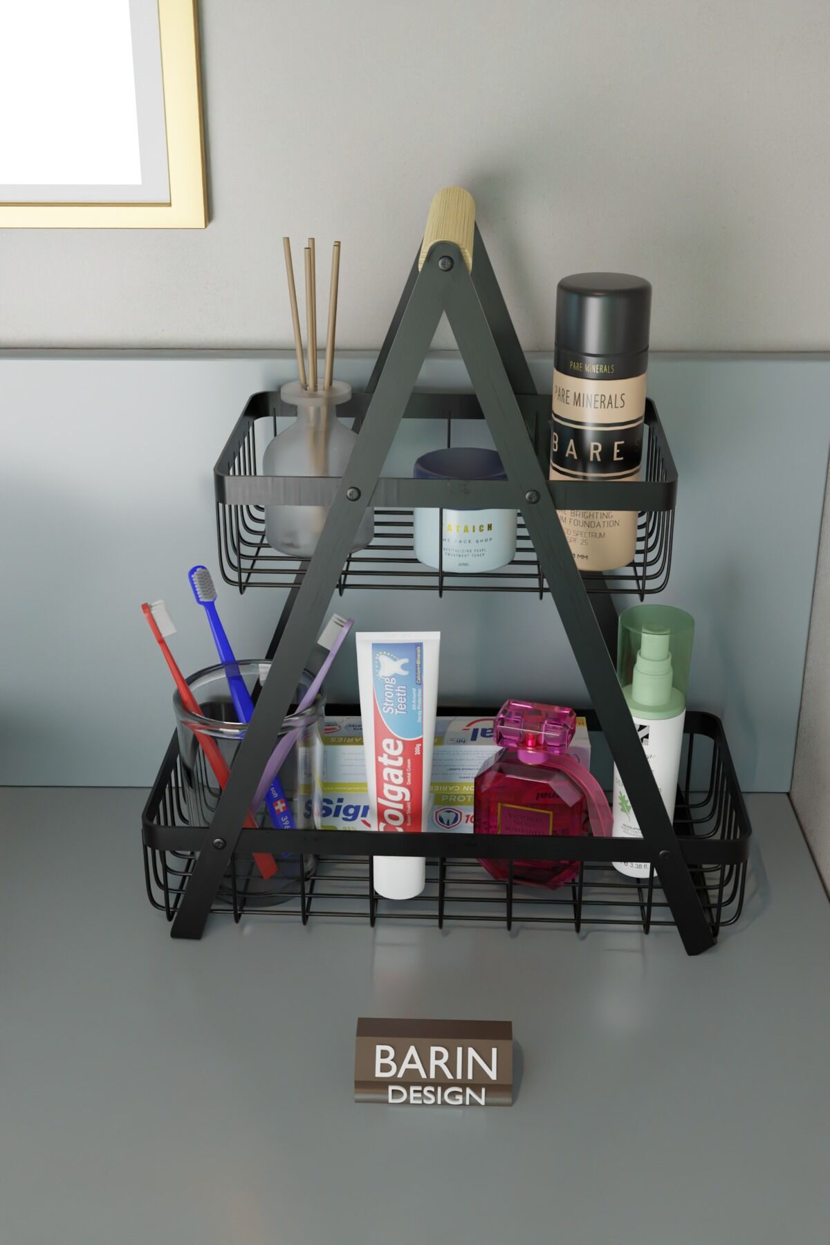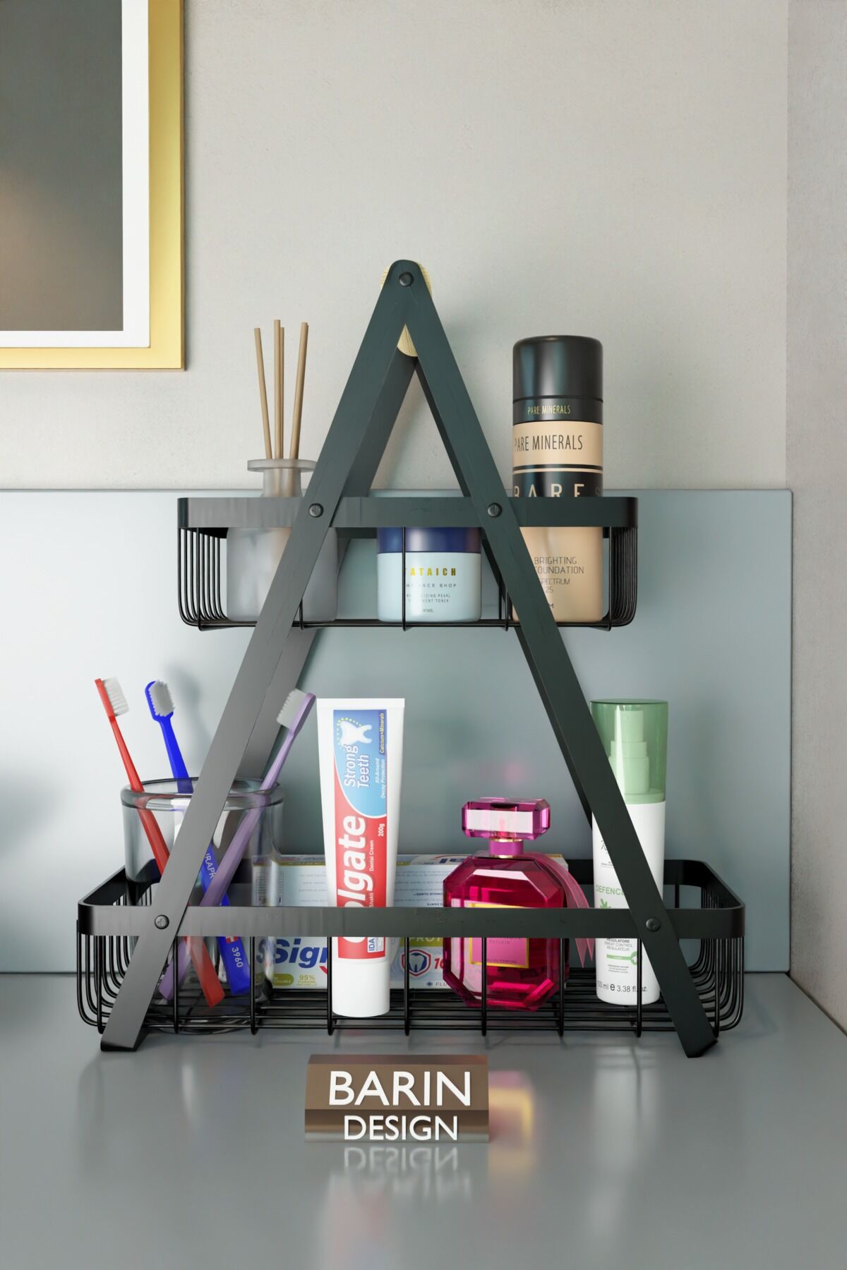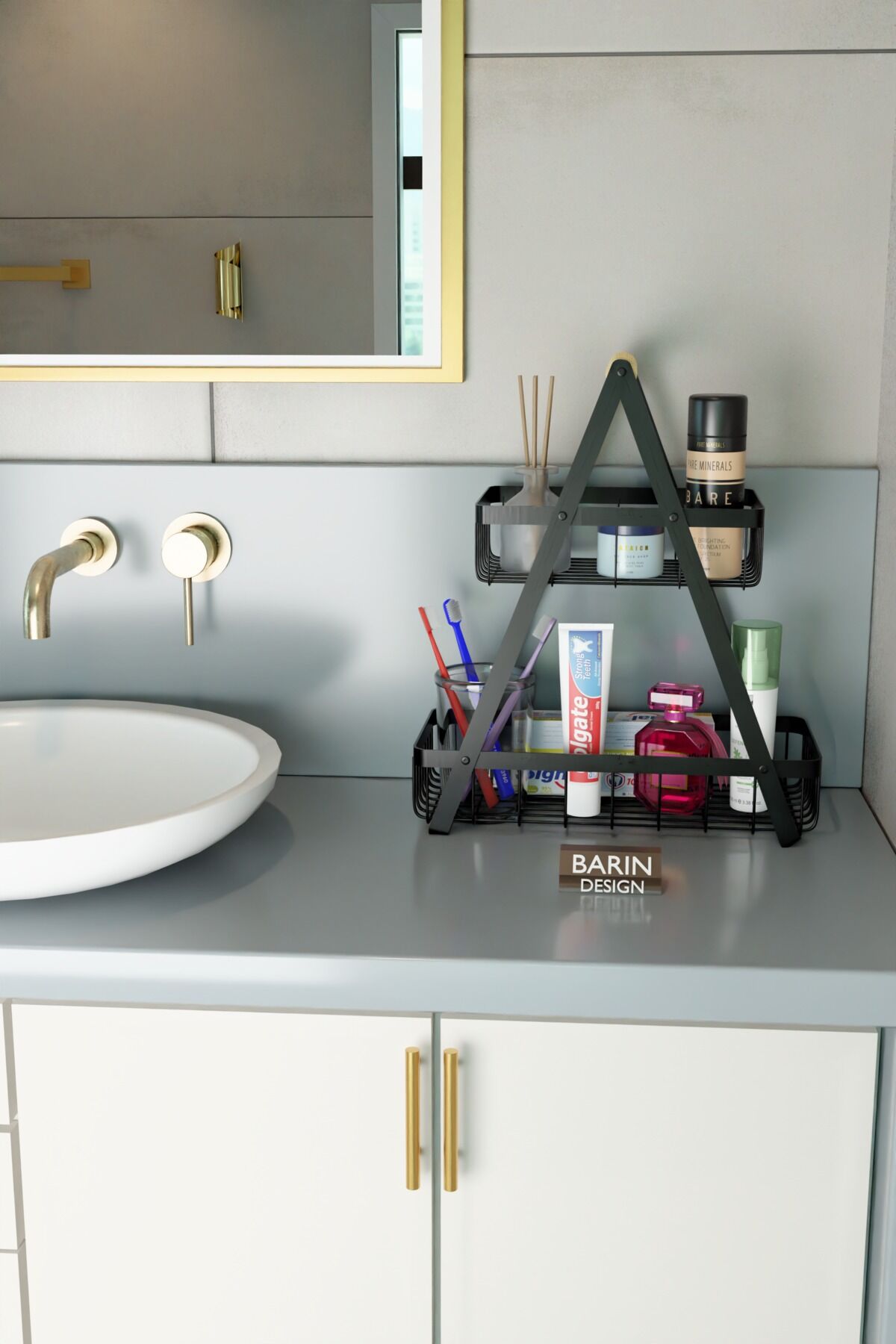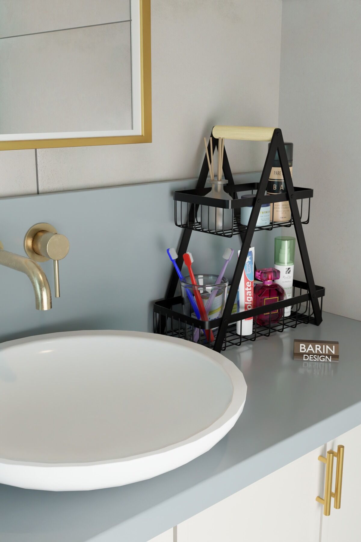 Barin Design Çift Katlı Metal Telli Banyo Düzenleyici Raf ile banyonuzda şıklık ve düzeni bir araya getirin. Kozmetik, kişisel bakım, parfüm ve günlük ihtiyaçlarınızı tek noktada, hijyenik ve estetik biçimde saklayın.