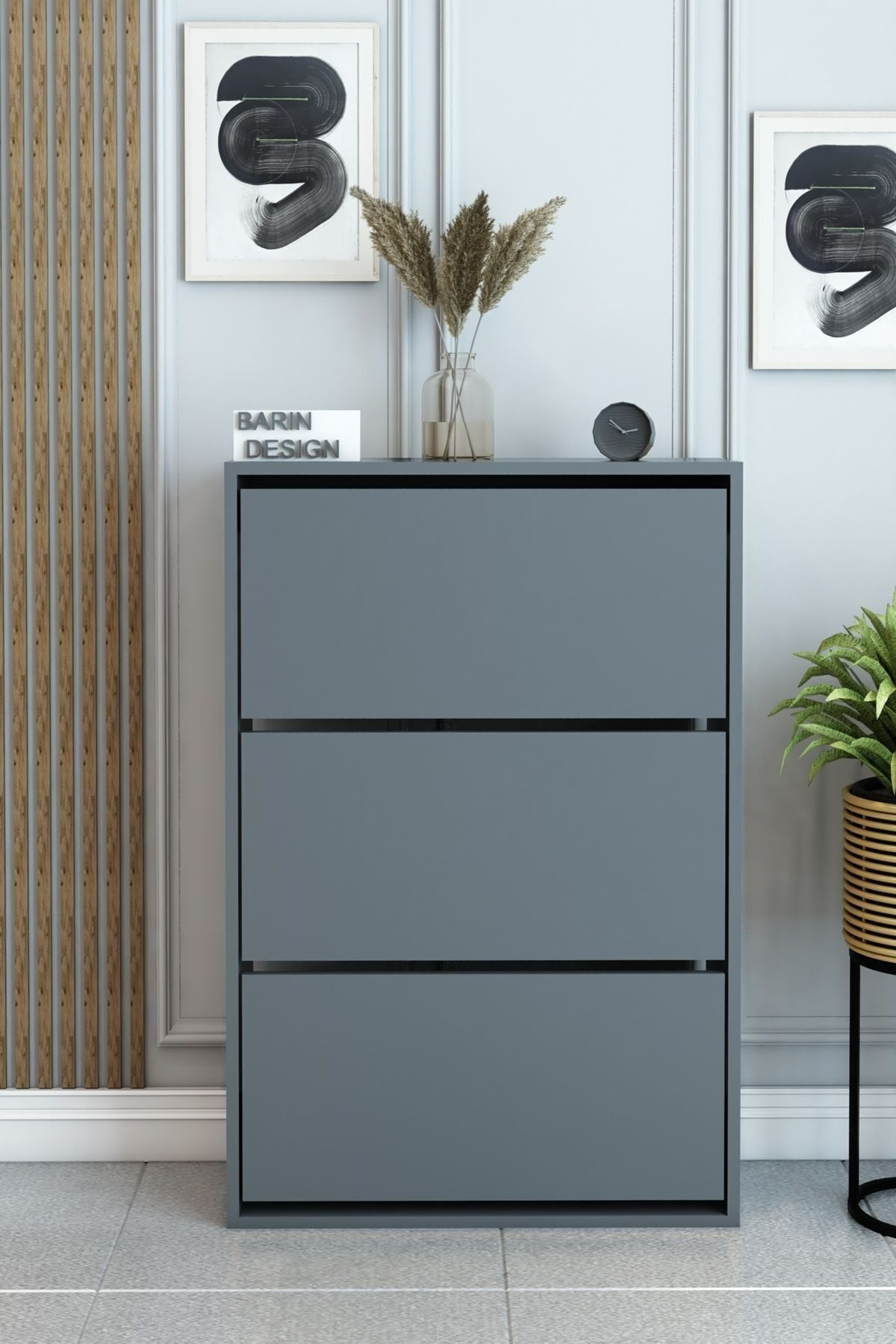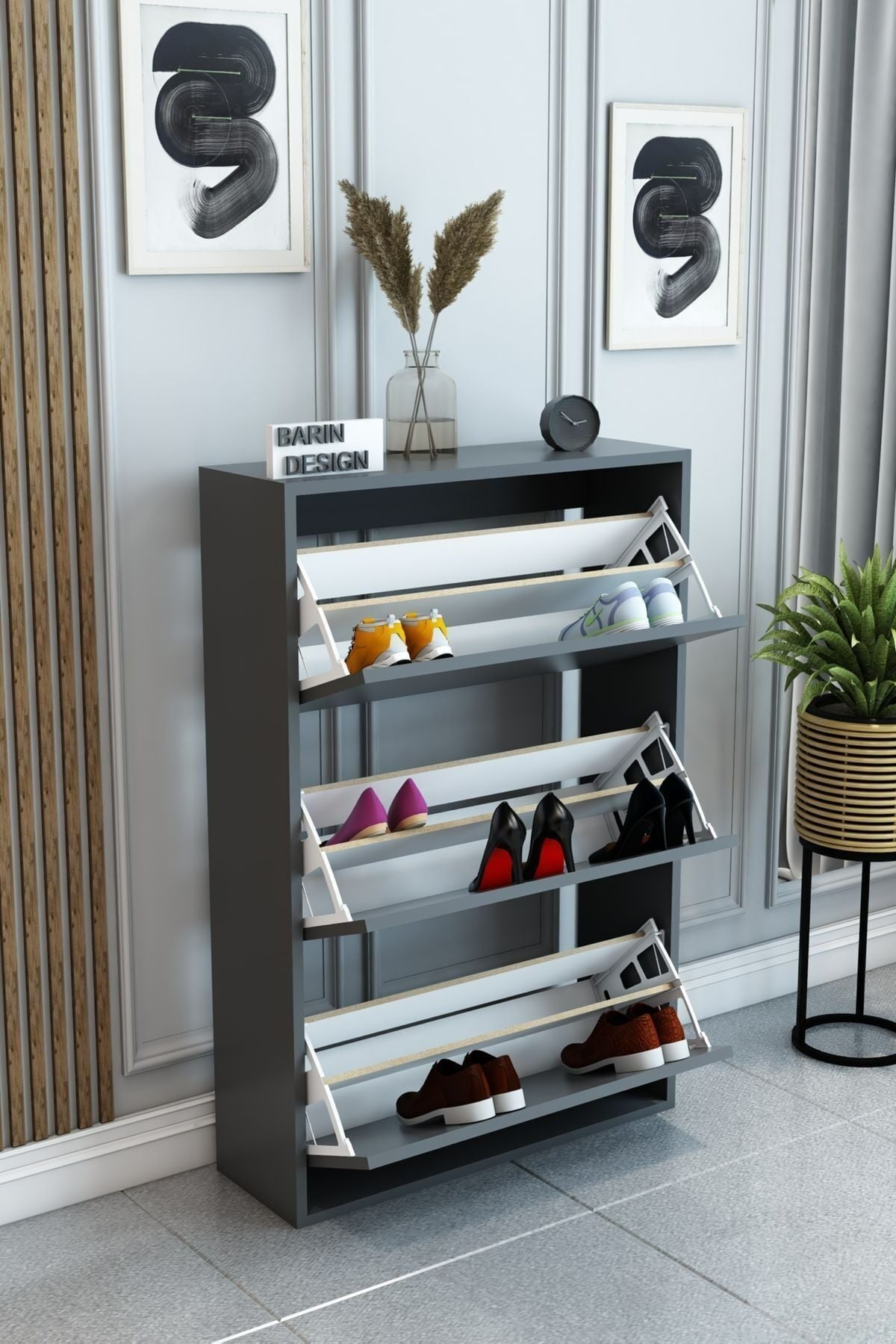 3 Raflı Ayakkabılık Düşer Kapak Kayar Kapak Vestiyer Portmanto Katlı Bölmeli Kapı Önü Modern Antrasit