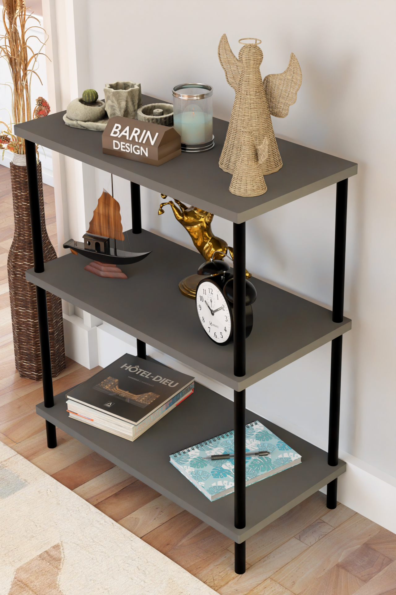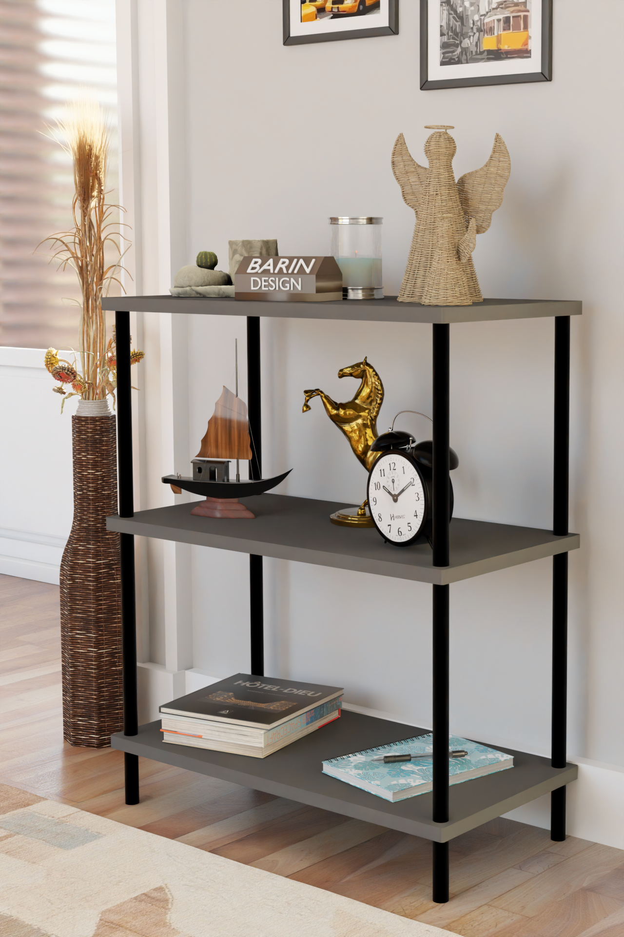 3 Raflı Çevir Kur Dekoratif Salon Rafı – Açık Raflı Kitaplık ve Aksesuar Düzenleyici, Pratik Kurulum Antrasit
