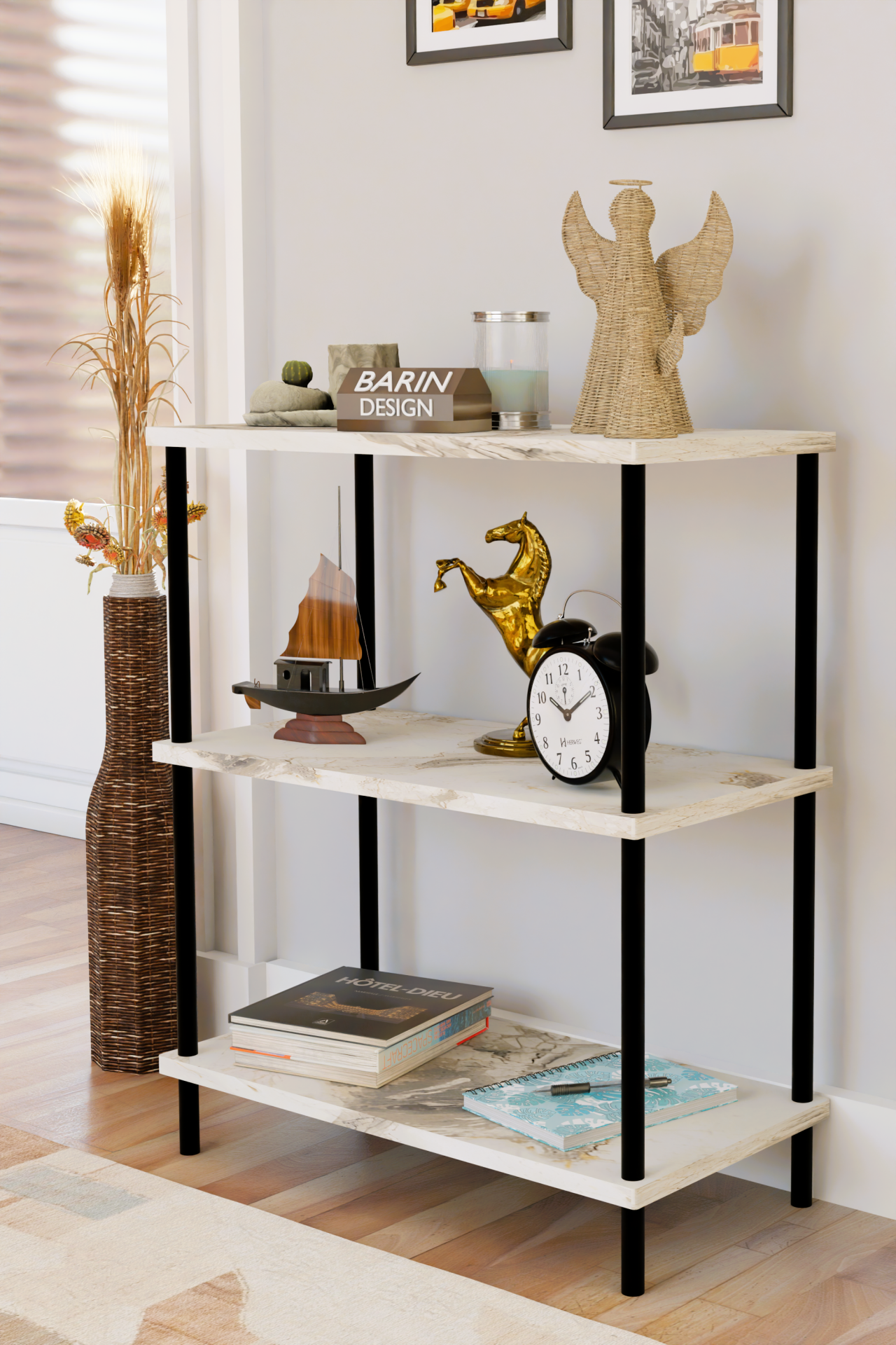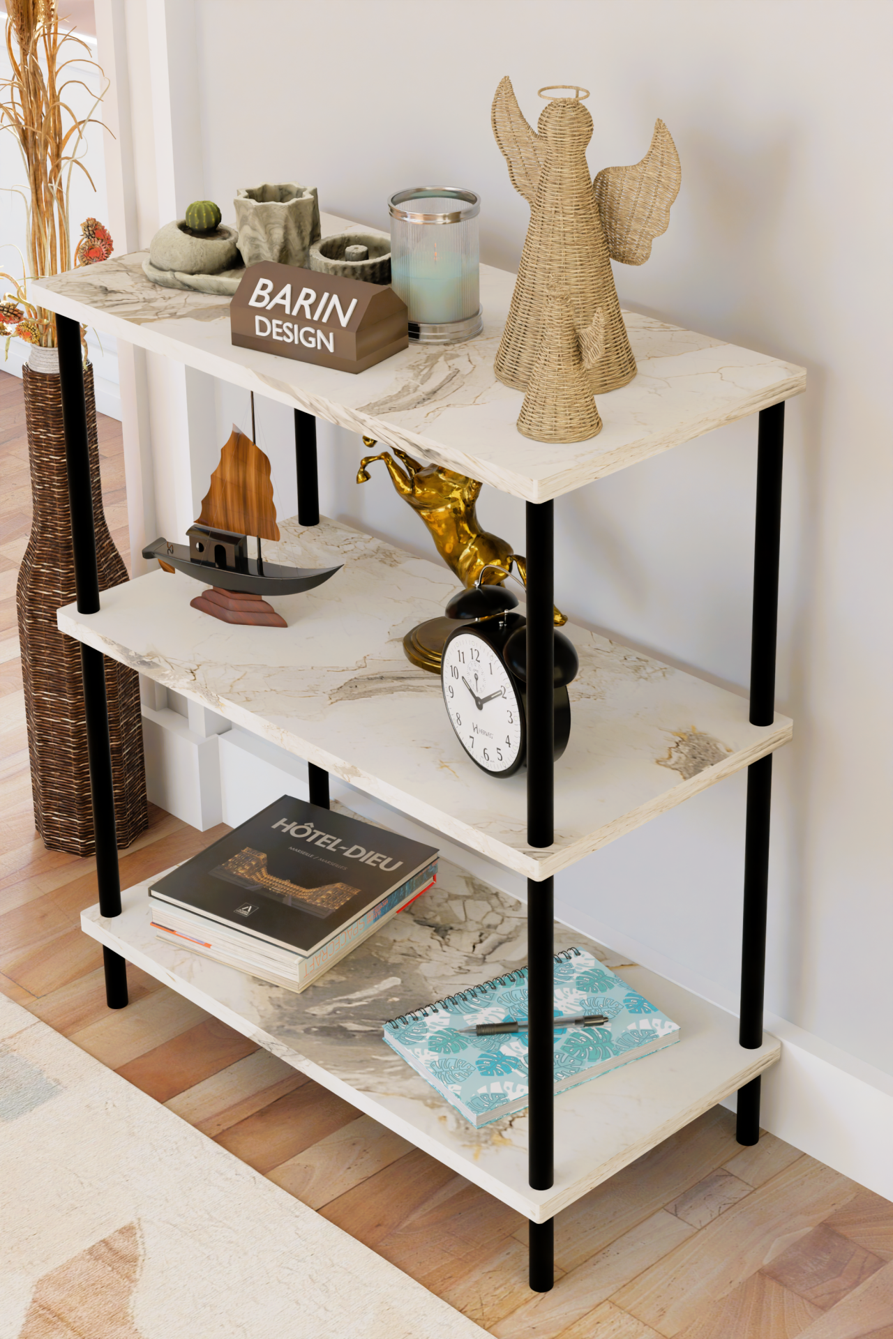 3 Raflı Çevir Kur Dekoratif Salon Rafı – Açık Raflı Kitaplık ve Aksesuar Düzenleyici, Pratik Kurulum Beyaz Mermer