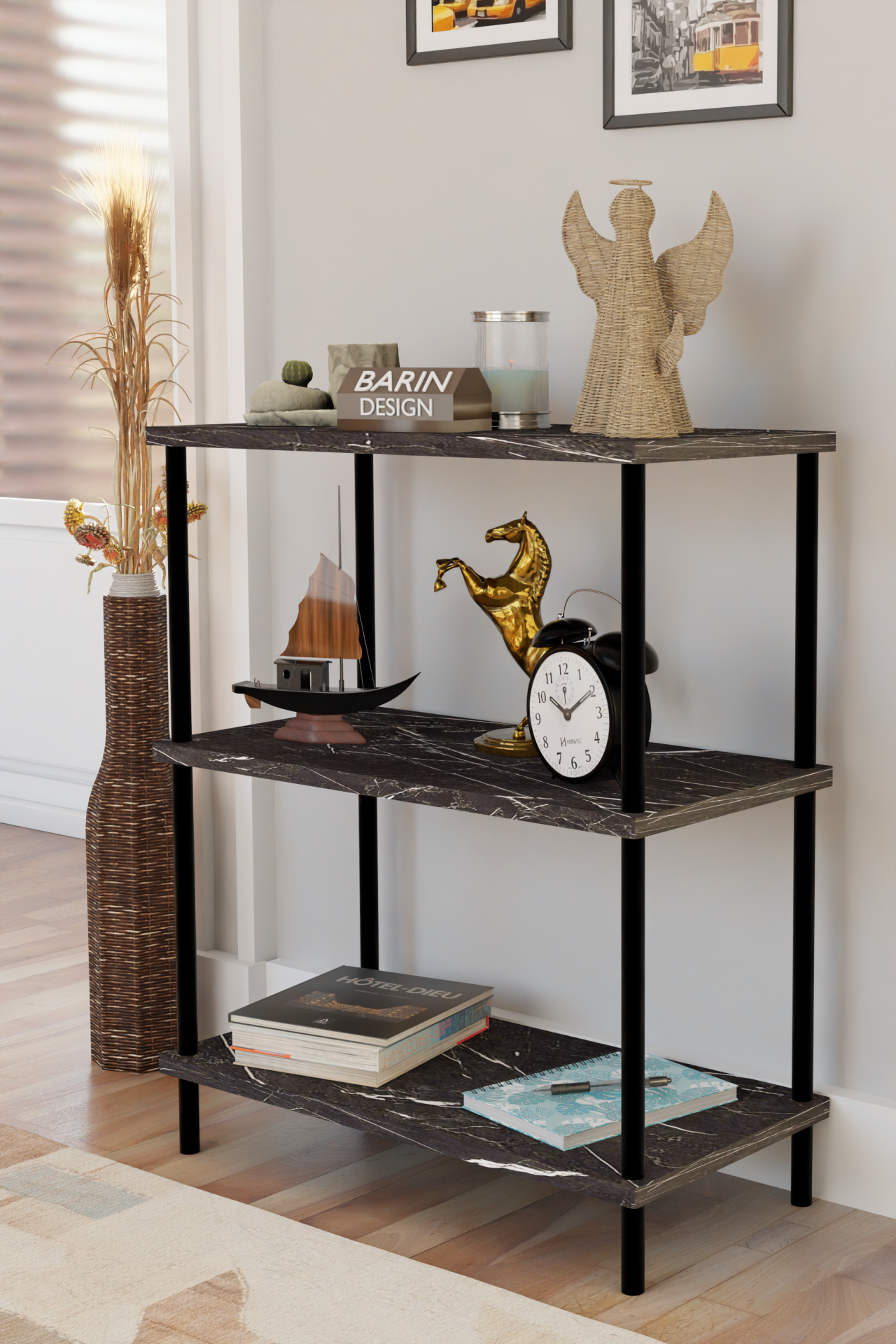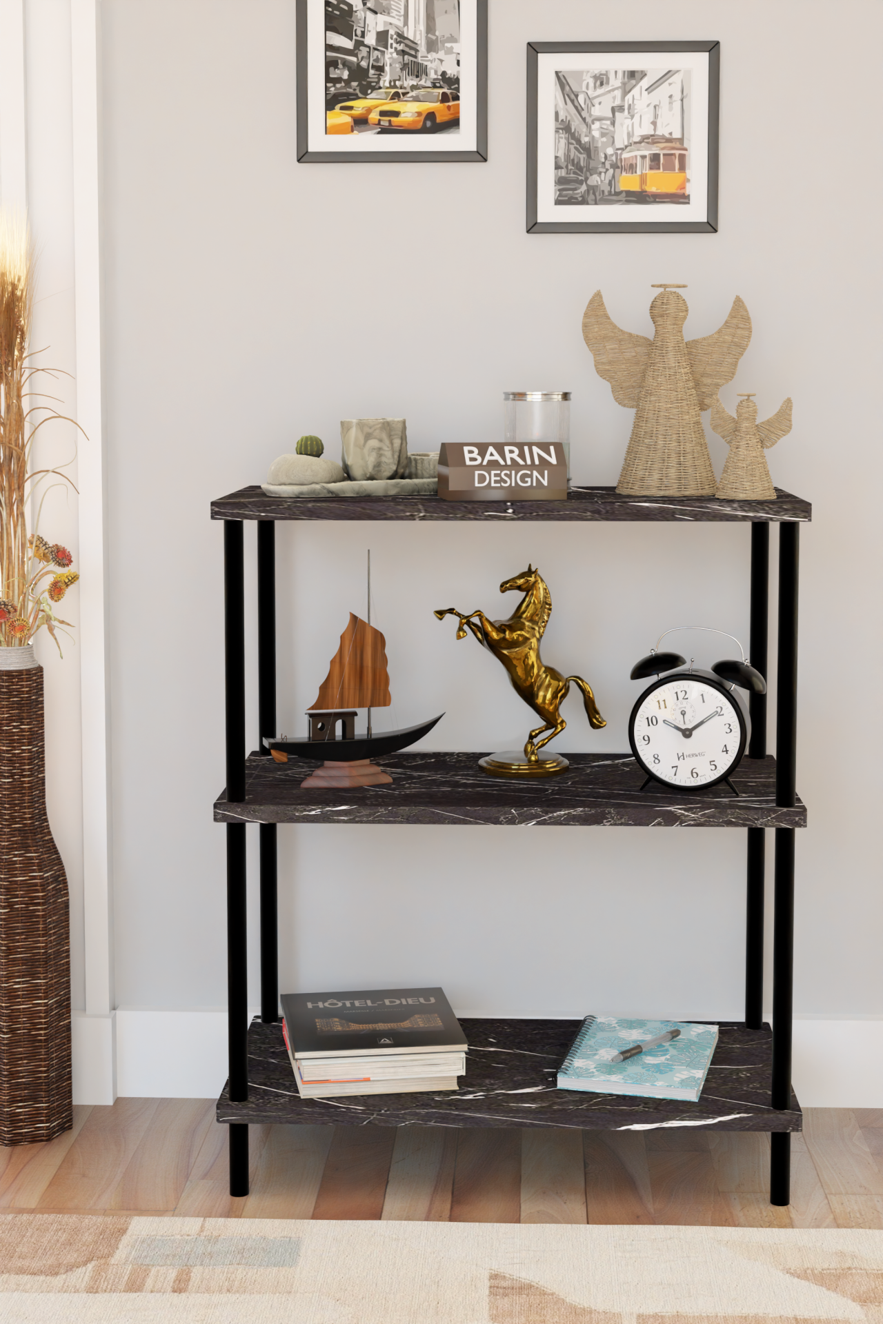 3 Raflı Çevir Kur Dekoratif Salon Rafı – Açık Raflı Kitaplık ve Aksesuar Düzenleyici, Pratik Kurulum Siyah Mermer