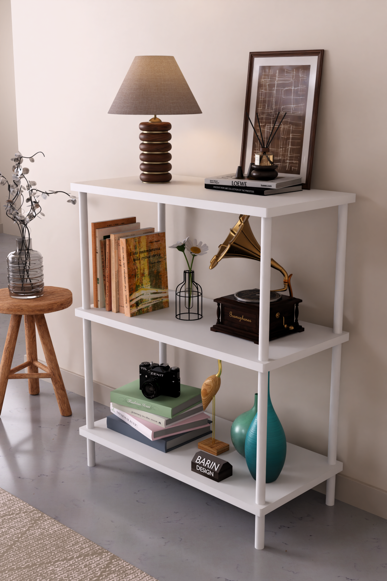 3 Raflı Çevir Tak Beyaz Metal Gövdeli Çok Amaçlı Salon Rafı ve Kitaplık Salon Organizeri