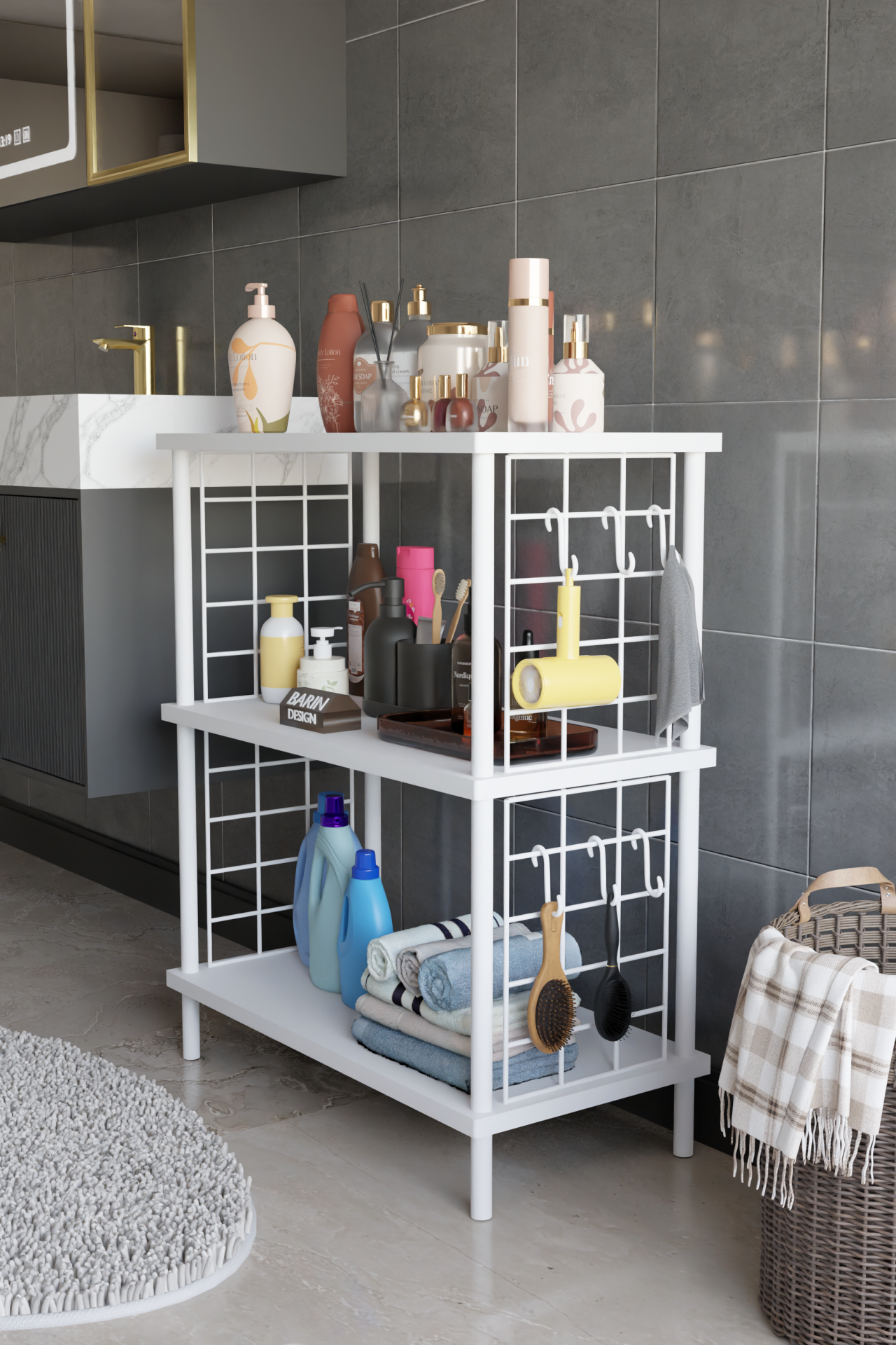 3 Raflı Çevir Tak Beyaz Telli Metal Gövdeli Çok Amaçlı Banyo Rafı ve Organizer Raf Banyo Dolabı Beyaz