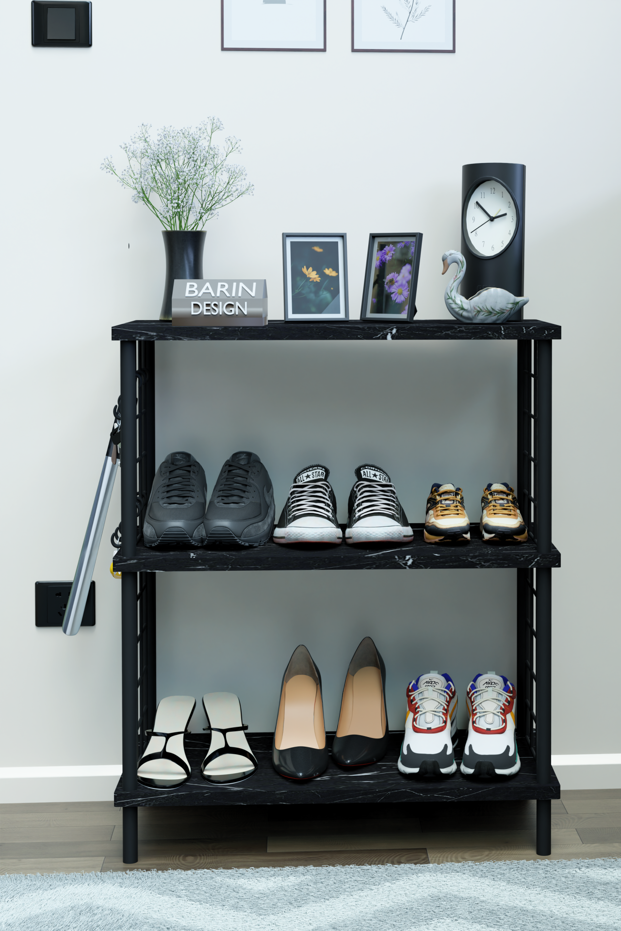 3 Raflı Metal Telli Çok Amaçlı Ayakkabılık ve Organizer Raf Kolay Kurulumlu, Çevir-Tak Sistem Raf Siyah Mermer