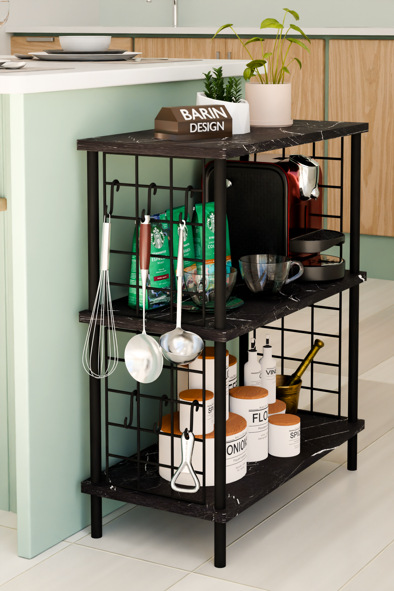 3 Raflı Telli Çevir-Kur Çok Amaçlı Raf Ünitesi | Metal Gövde Mutfak Düzenleyici | Pratik Organizer Siyah Mermer