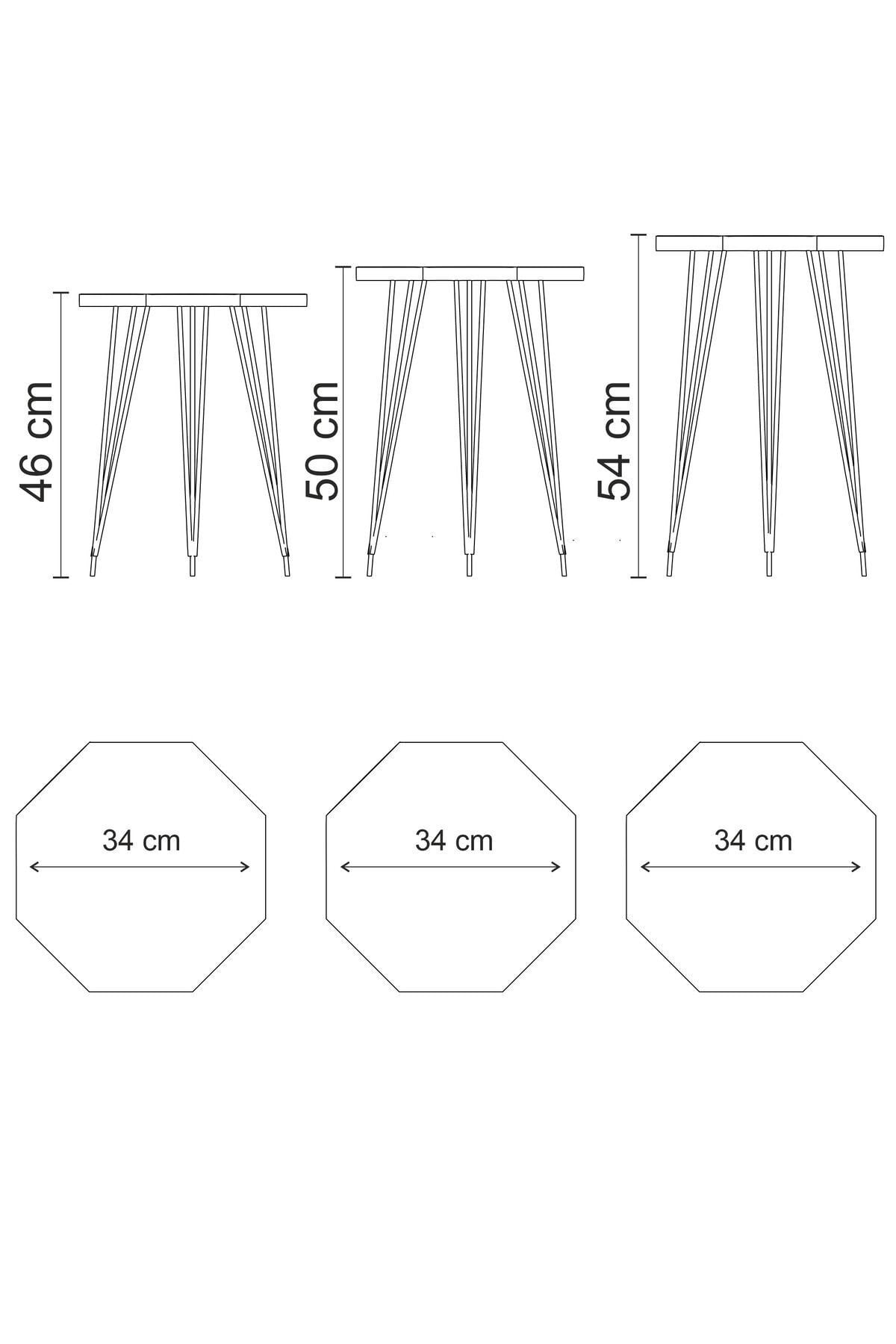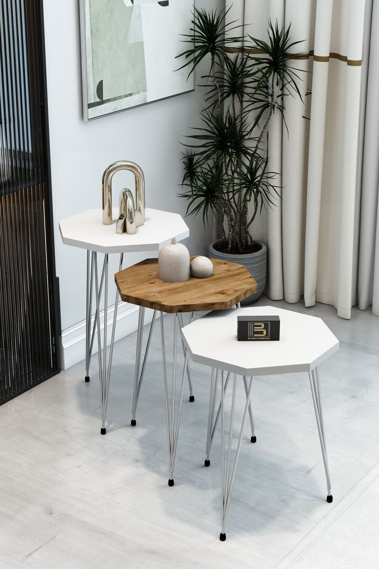 3'lü Sekizgen Zigon Sehpa Seti - Gümüş Metal Ayaklı, Modern & Şık Yan Sehpa, Dayanıklı Salon Ofis 2 Beyaz 1 Atlantik Çam