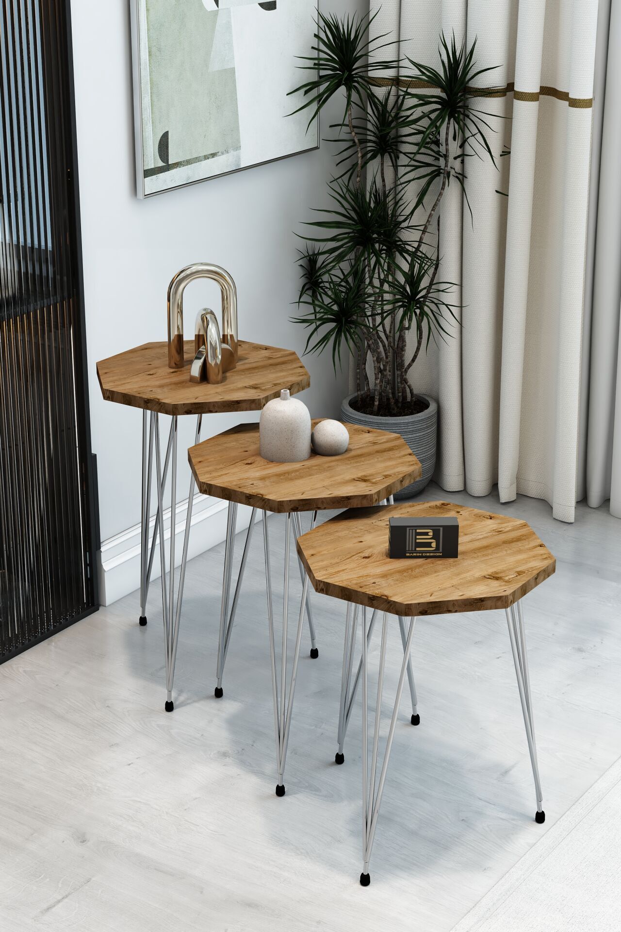 3'lü Sekizgen Zigon Sehpa Seti - Gümüş Metal Ayaklı, Modern & Şık Yan Sehpa, Dayanıklı Salon Ofis Atlantik Çam