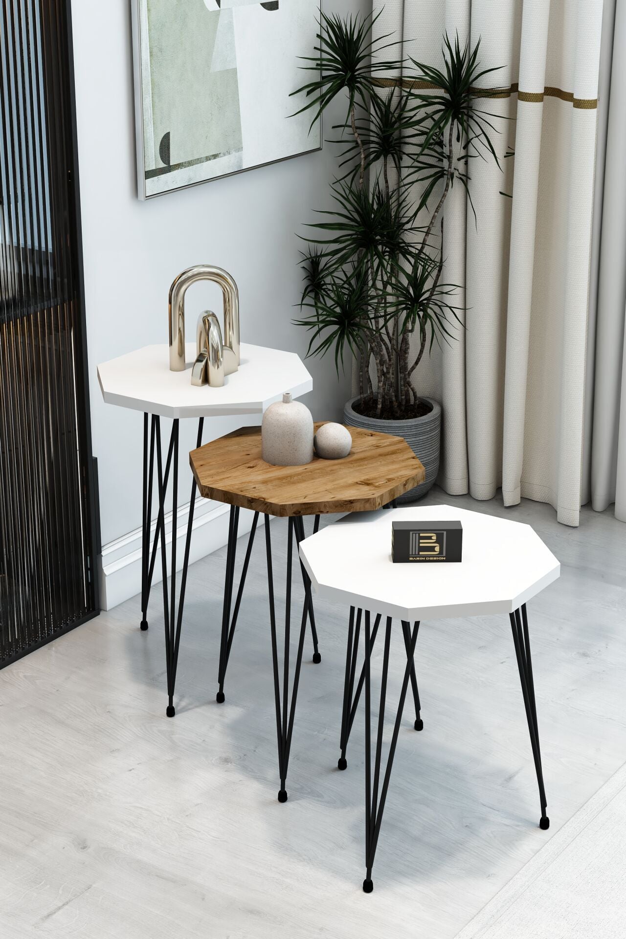 3'lü Sekizgen Zigon Sehpa Seti - Siyah Metal Ayaklı, Modern & Şık Yan Sehpa, Dayanıklı Salon Ofis 2 Beyaz 1 Atlantik Çam