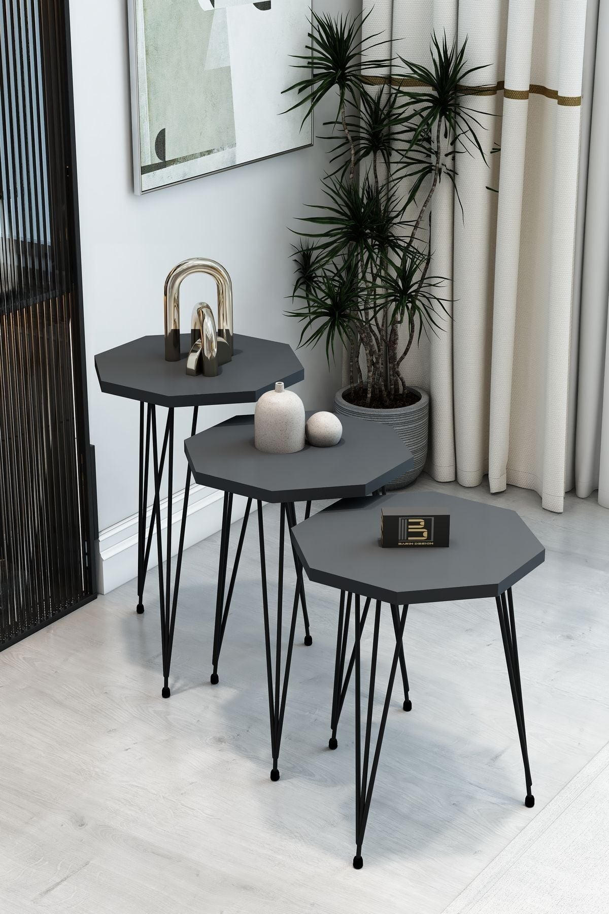 3'Lü Sekizgen Zigon Sehpa ve Dikdörtgen Orta Sehpa Takımı Modern Siyah Metal Ayaklı Salon Sehpa Seti Antrasit