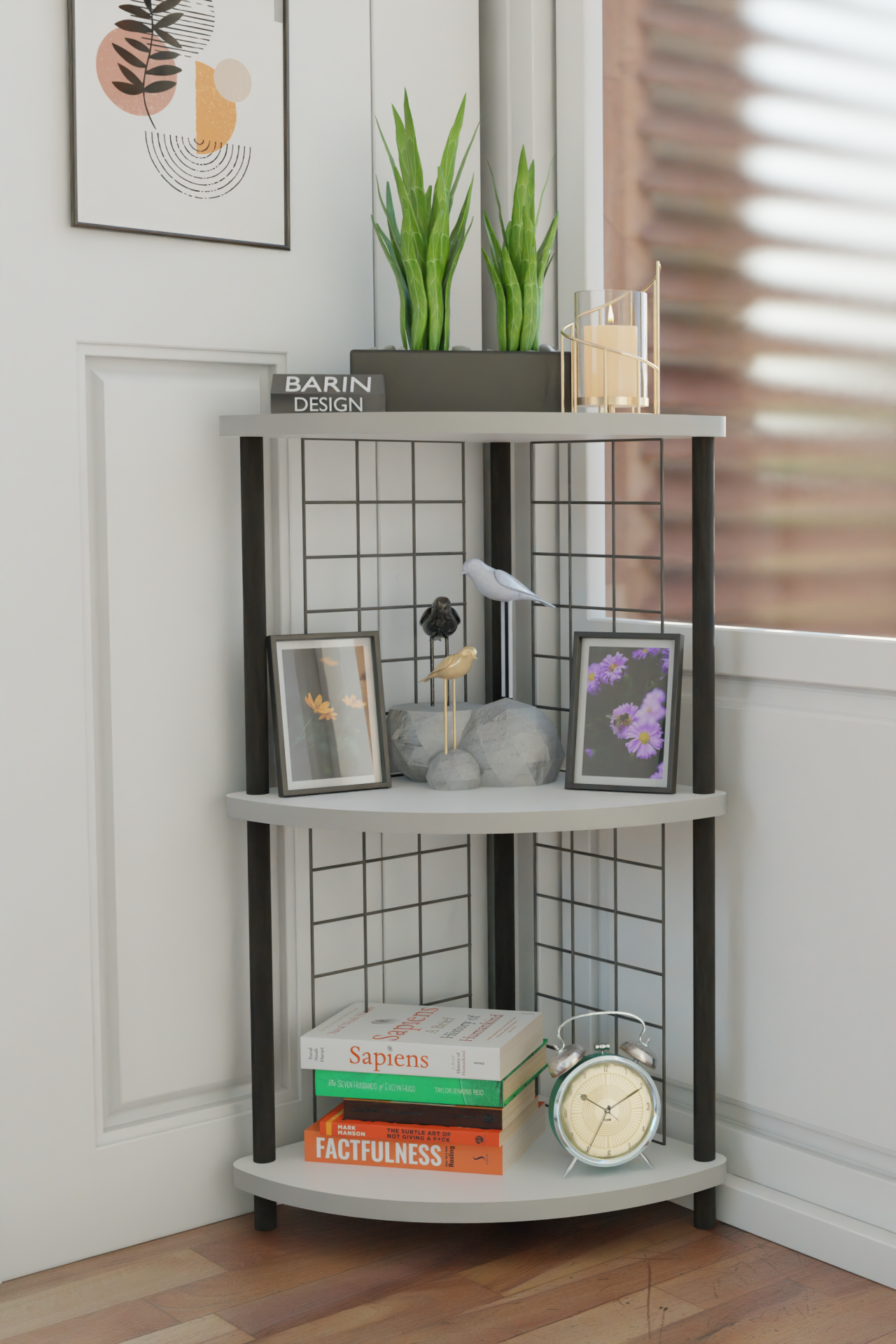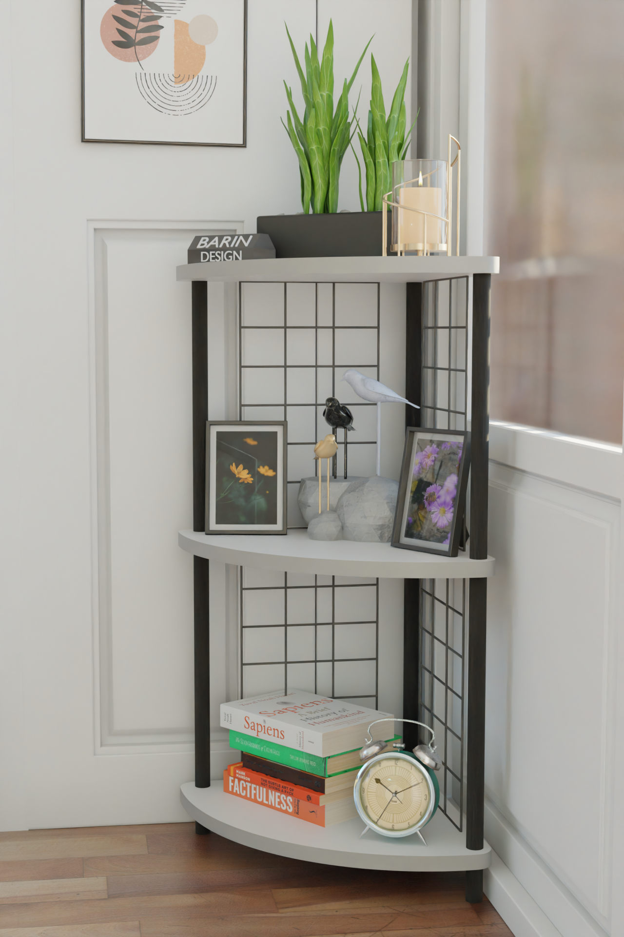 3Raflı Metal Telli Köşe Kitaplık Çevir-Kur Raf Ünitesi Modern Salon Dekoratif Raf Ofis Çalışma Odası Beyaz