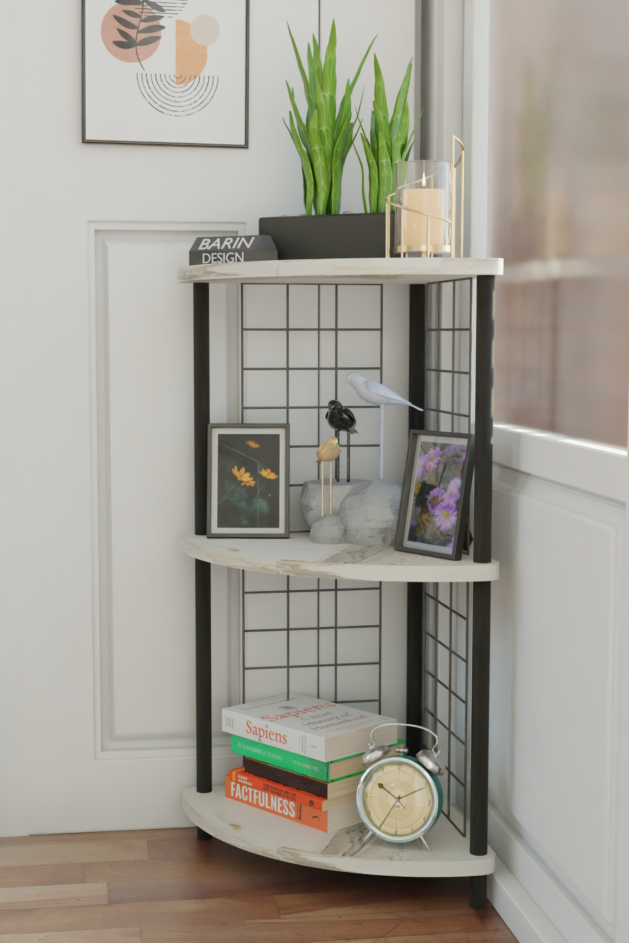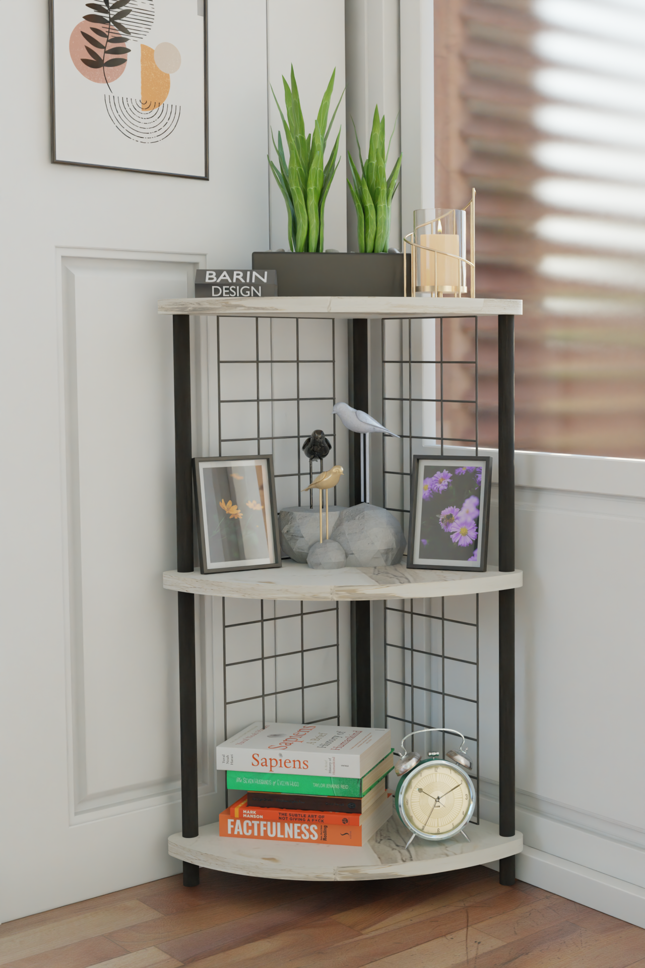 metal telli kitaplık, salon köşe rafı, çevir kur sistemli raf, kolay kurulum kitaplık, dekoratif kitaplık raf, metal tel dekoratif raf, modern salon kitaplık, barin design köşe raf, 3 katlı salon rafı, tel detaylı kitaplık, köşe kitaplık raf sistemi