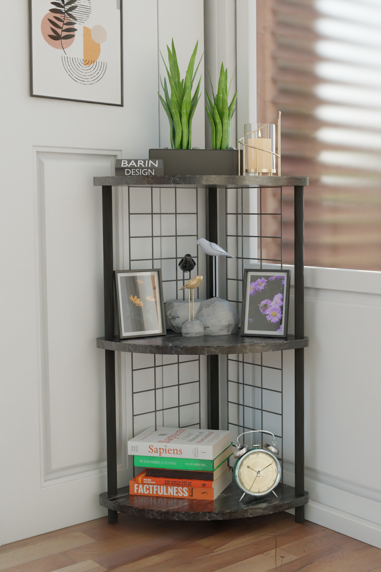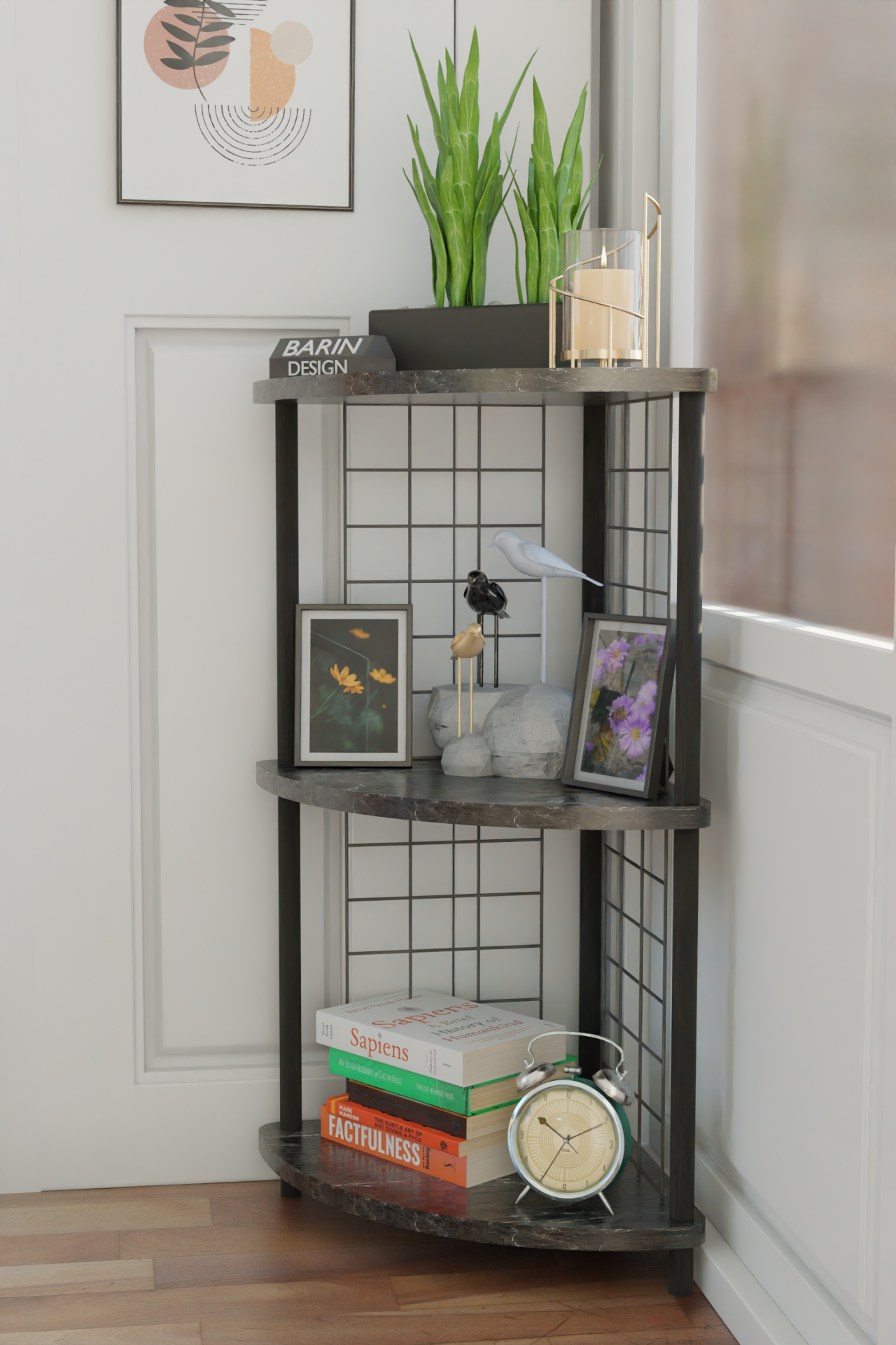 3Raflı Metal Telli Köşe Kitaplık Çevir-Kur Raf Ünitesi Modern Salon Dekoratif Raf Ofis Çalışma Odası Siyah Mermer