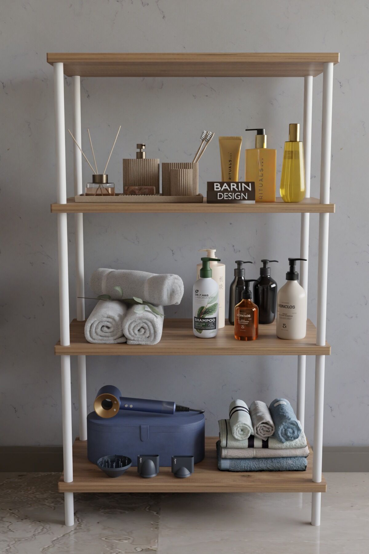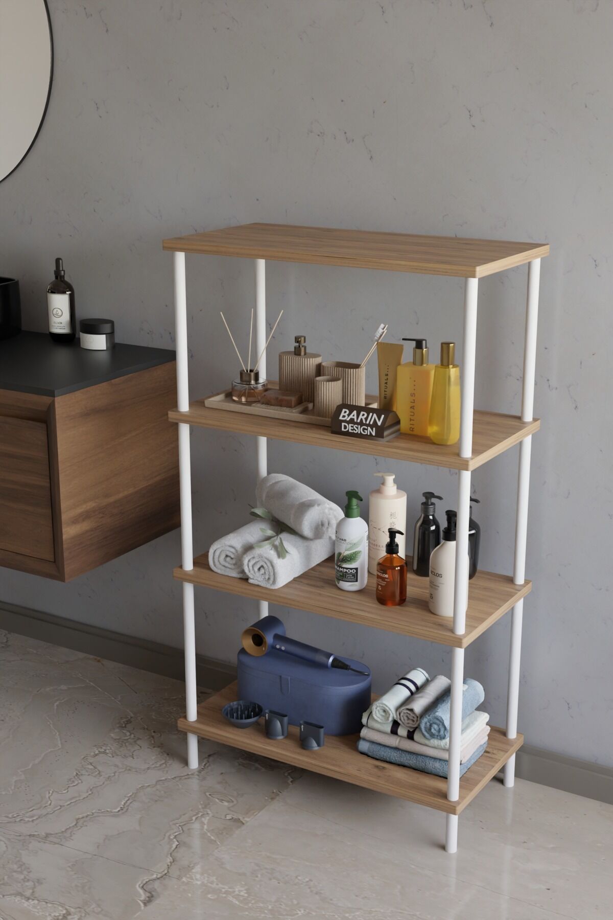 4 raflı raf ünitesi, çevir kur kolay kurulum, çok amaçlı düzenleyici raf, metal gövdeli raf sistemi, banyo rafı, mutfak rafı, antre rafı, ev içi düzenleyici, BARIN DESIGN raf modeli