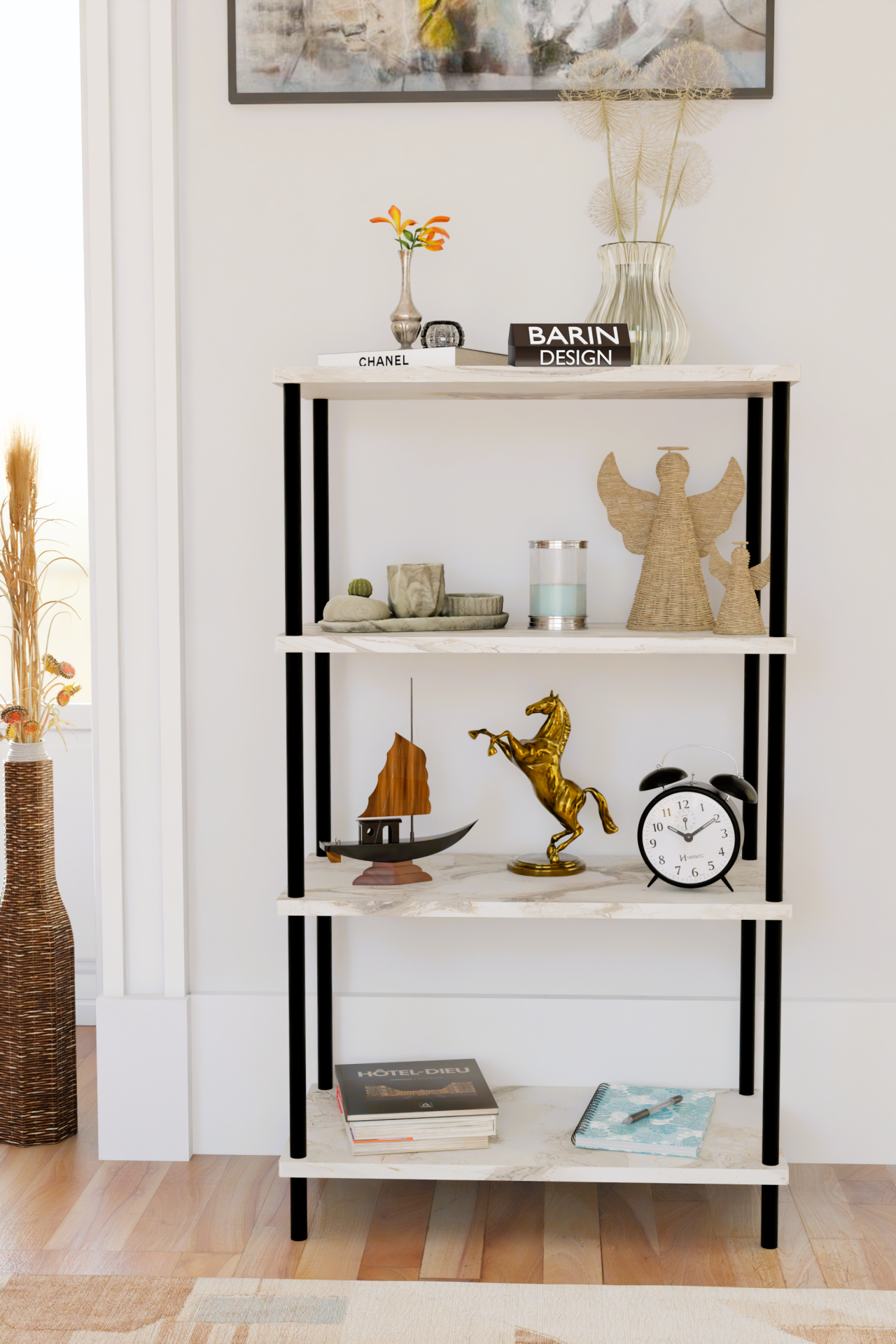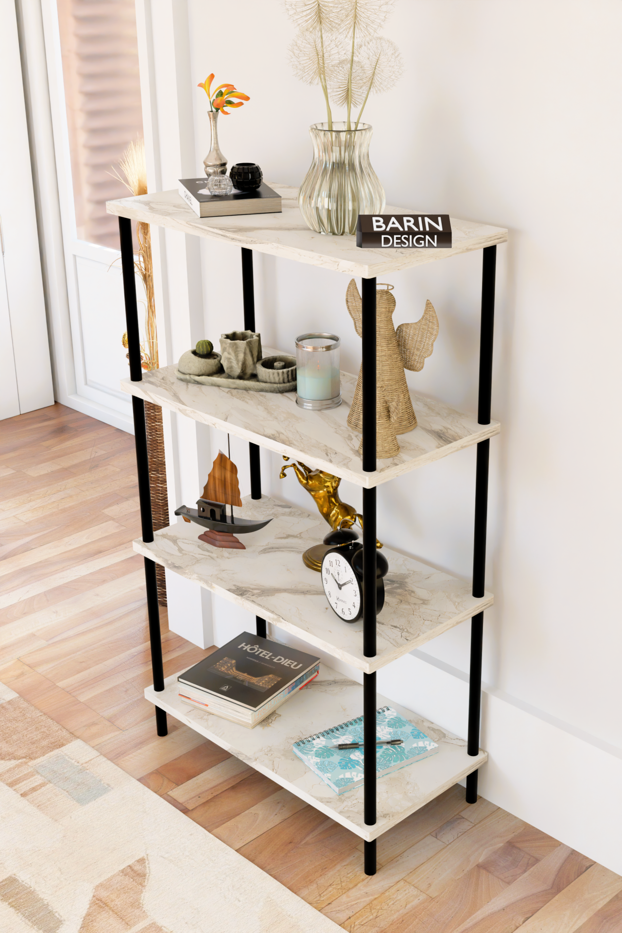 4 Katlı Çevir-Kur Sistemli Kitaplık Raf Metal Gövdeli Ahşap Raflı Çok Amaçlı Düzenleyici RafÜnitesi Beyaz Mermer