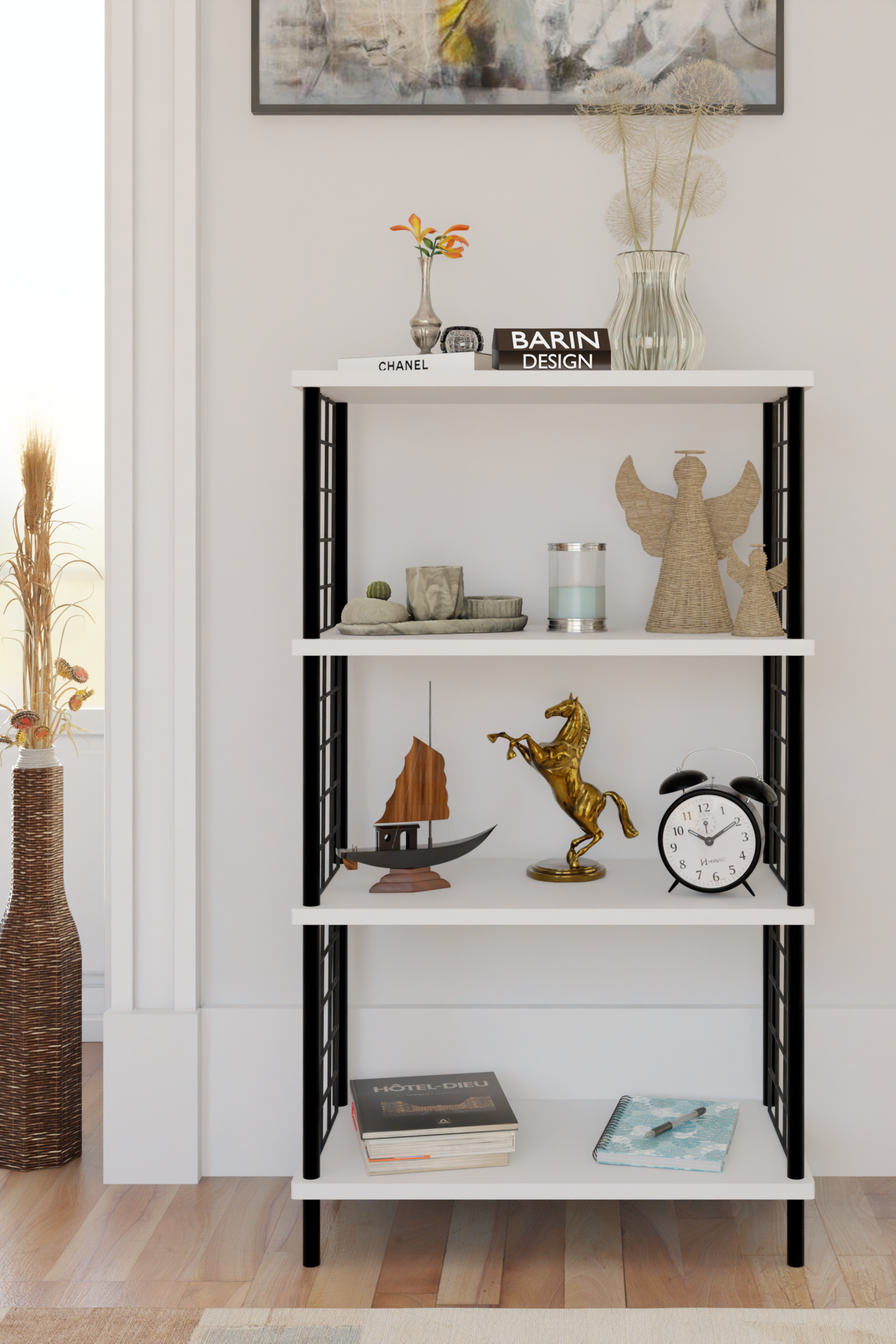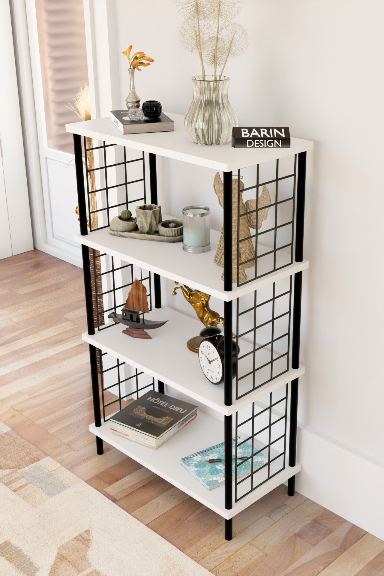 4 Katlı Çevir-Kur Sistemli Metal Yan Telli Ahşap Raf Çok Amaçlı Kitaplık, Dekoratif Düzenleyici Beyaz