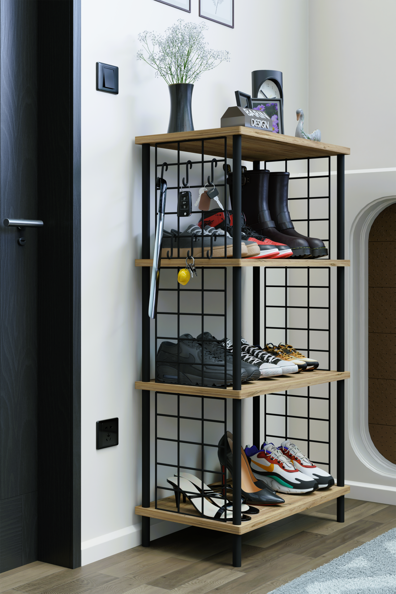 4 Katlı Metal Telli Ayakkabılık – Çevir Kur Sistemli Çok Katlı Portmanto Rafı ve Anahtarlık Askısı Atlantik Çam