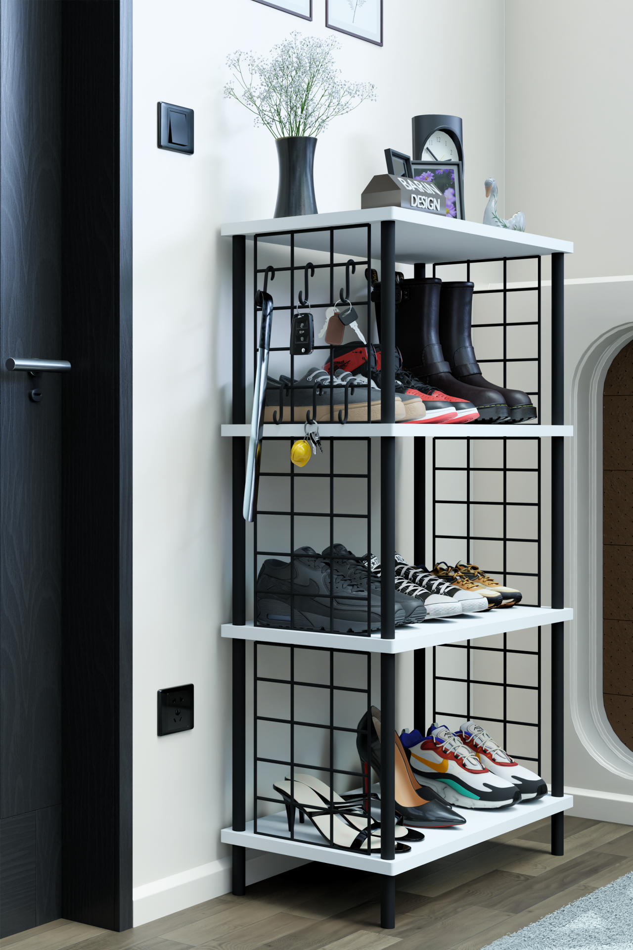 4 Katlı Metal Telli Ayakkabılık – Çevir Kur Sistemli Çok Katlı Portmanto Rafı ve Anahtarlık Askısı Beyaz