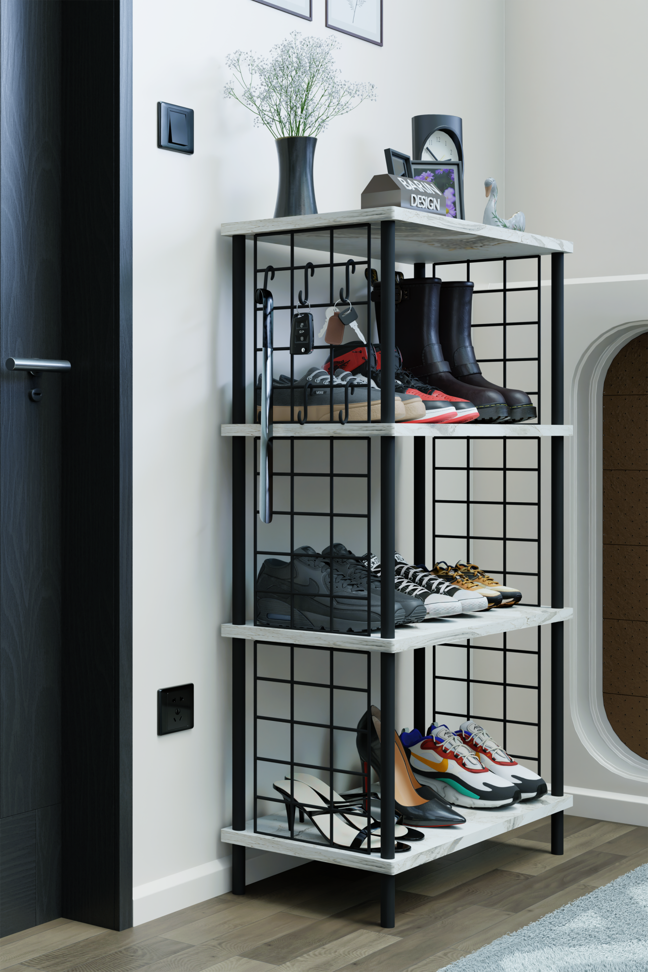4 Katlı Metal Telli Ayakkabılık – Çevir Kur Sistemli Çok Katlı Portmanto Rafı ve Anahtarlık Askısı Beyaz Mermer