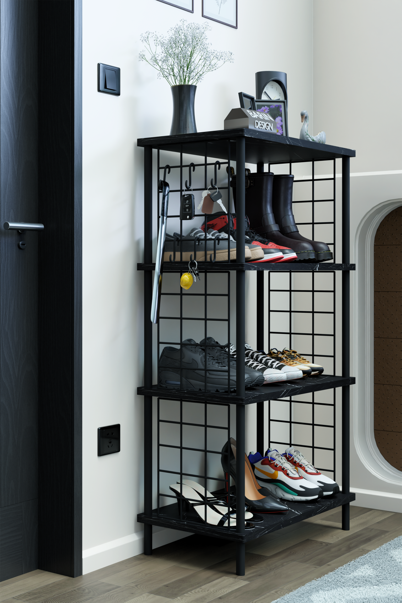 4 Katlı Metal Telli Ayakkabılık – Çevir Kur Sistemli Çok Katlı Portmanto Rafı ve Anahtarlık Askısı Siyah Mermer
