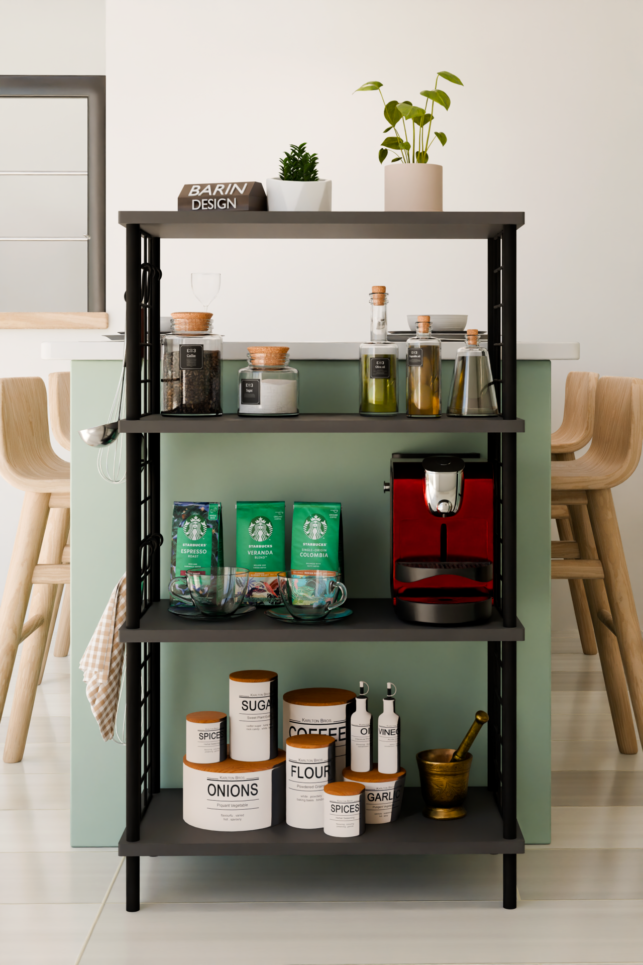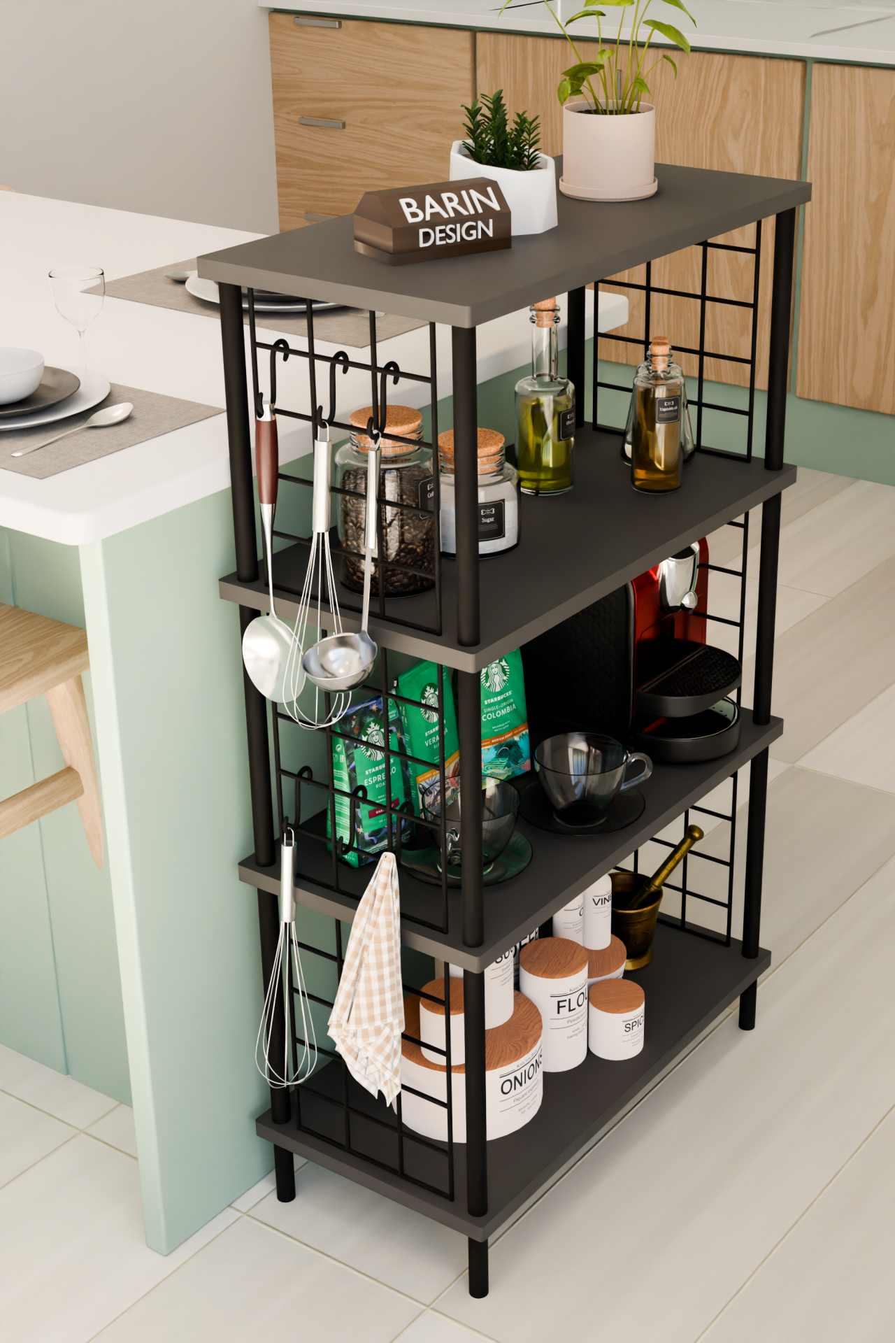 4 Katlı Metal Telli Raf Ünitesi Çevir Kur Sistemli Kahve Köşesi ve Mutfak Düzenleyici Raf Açık Dolap Antrasit