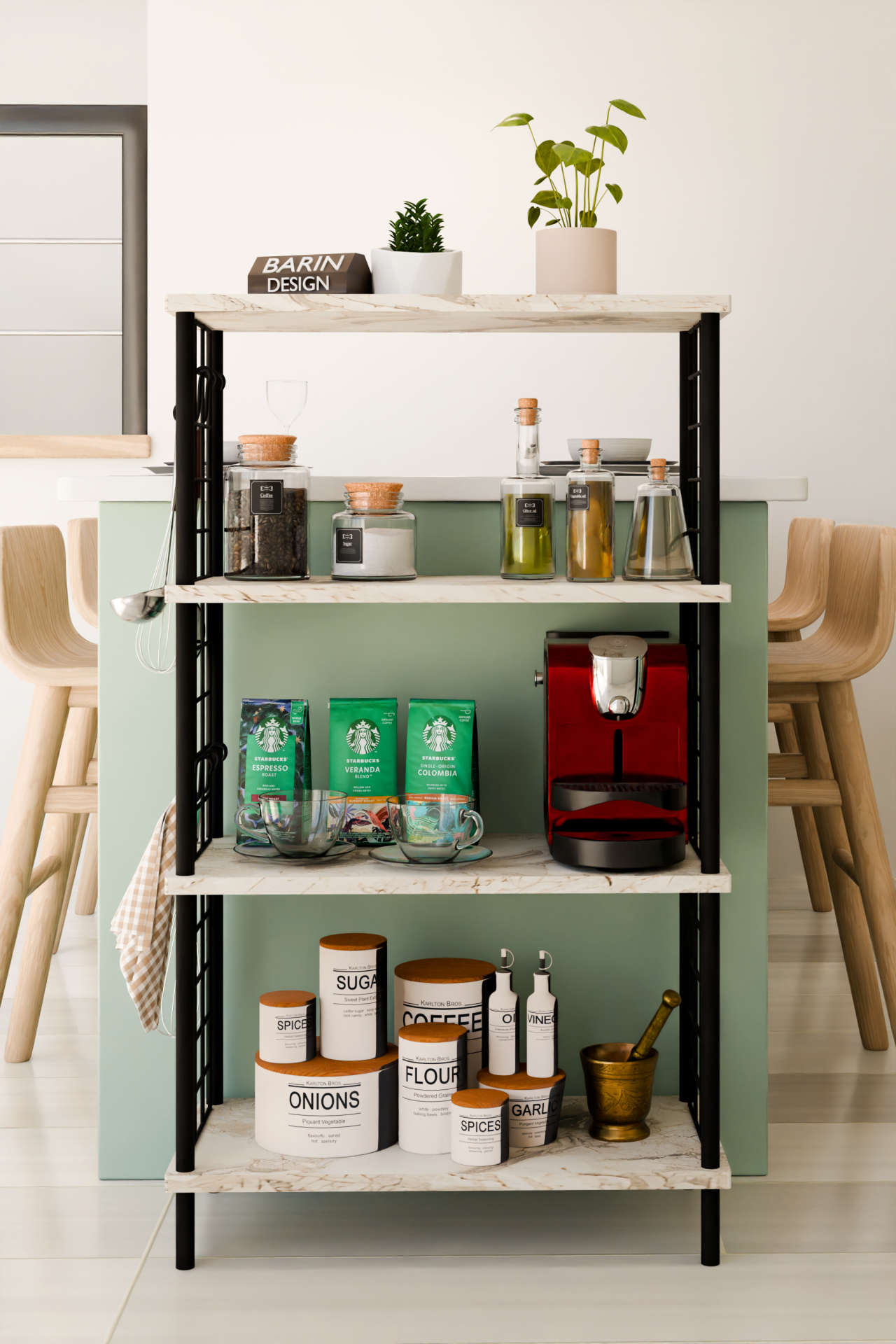 4 Katlı Metal Telli Raf Ünitesi Çevir Kur Sistemli Kahve Köşesi ve Mutfak Düzenleyici Raf Açık Dolap Beyaz Mermer