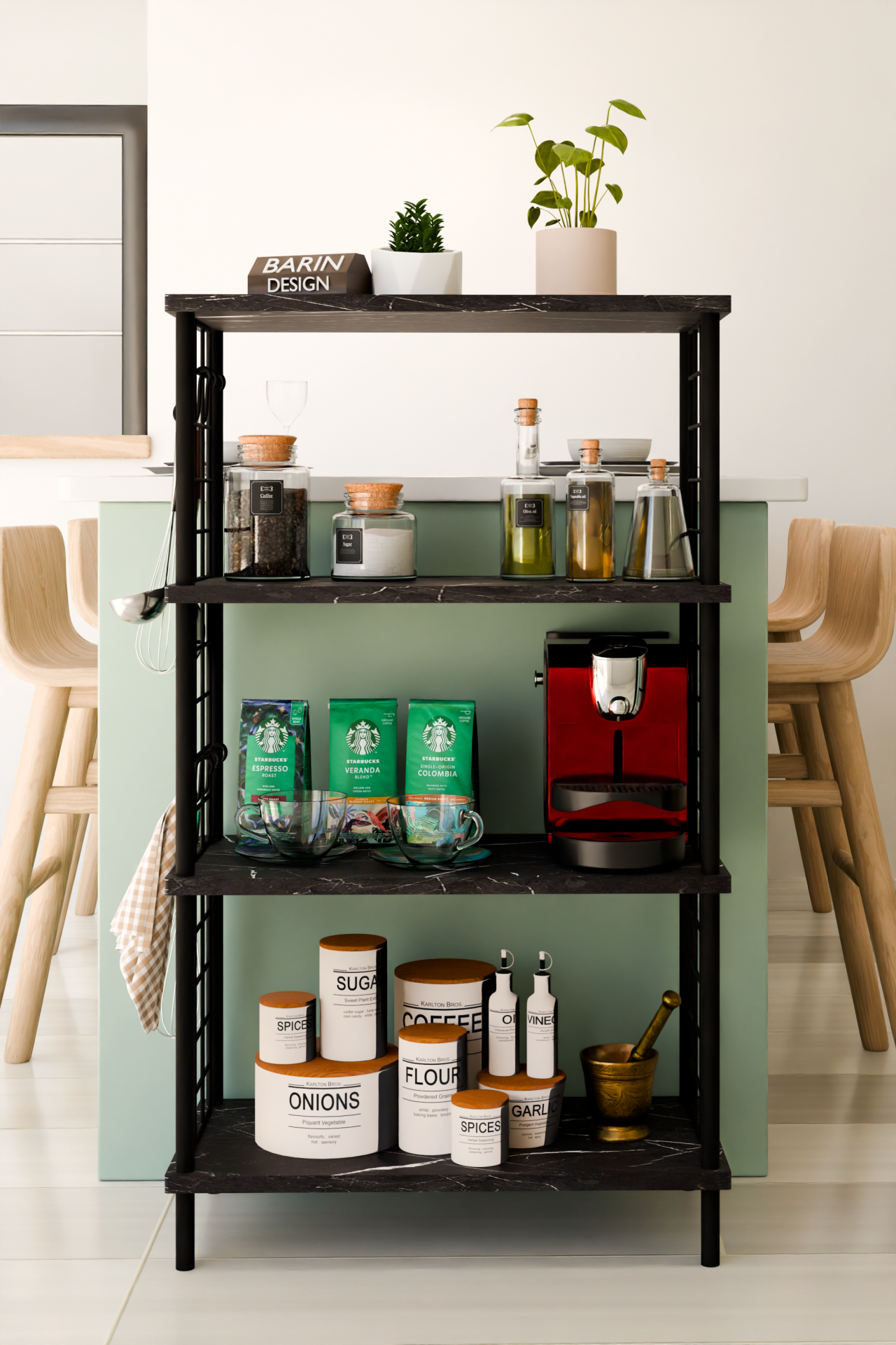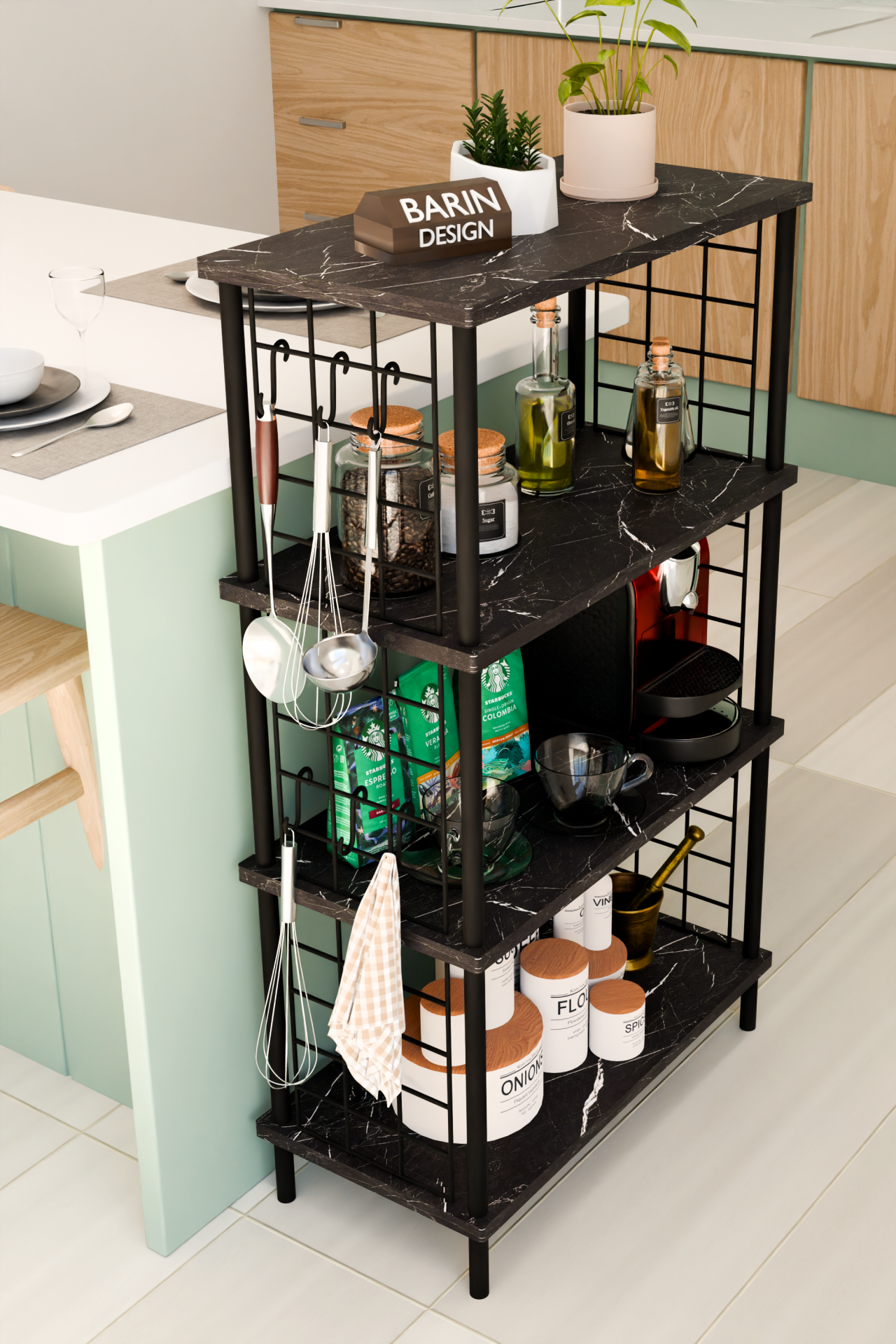 4 Katlı Metal Telli Raf Ünitesi Çevir Kur Sistemli Kahve Köşesi ve Mutfak Düzenleyici Raf Açık Dolap Siyah Mermer