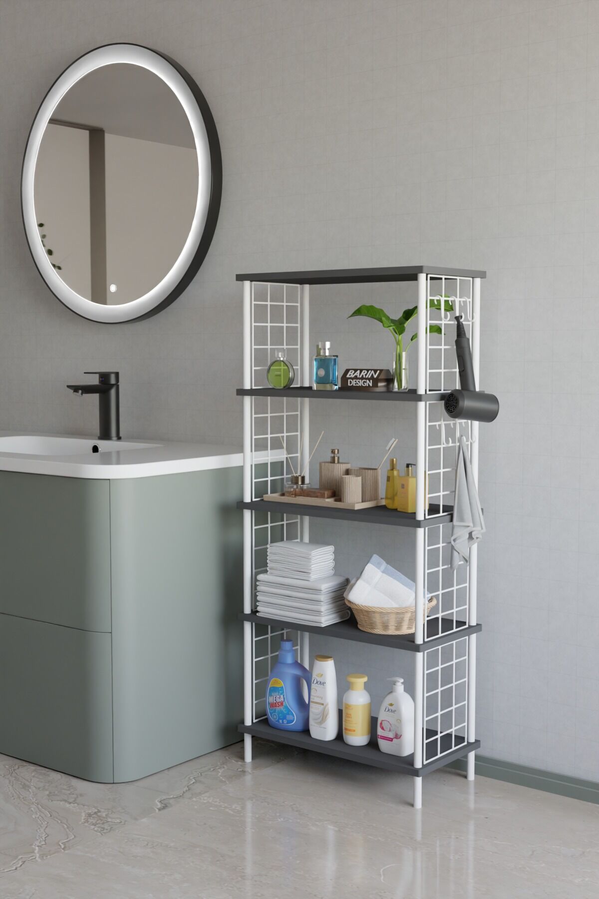 5 raflı raf ünitesi, çevir kur kolay kurulum, çok amaçlı düzenleyici raf, metal gövdeli raf sistemi, banyo rafı, mutfak rafı, antre rafı, ev içi düzenleyici, BARIN DESIGN raf modeli