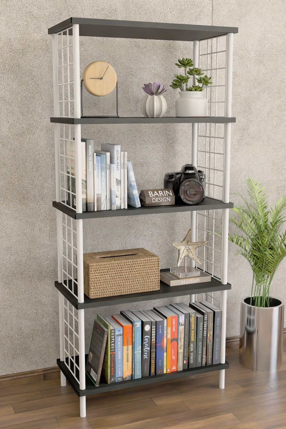 5 Raflı Beyaz Telli Metal Kitaplık Salon, Ofis, Çalışma Odası - Düzenleyici Çevir Tak Kolay Kurulum Antrasit