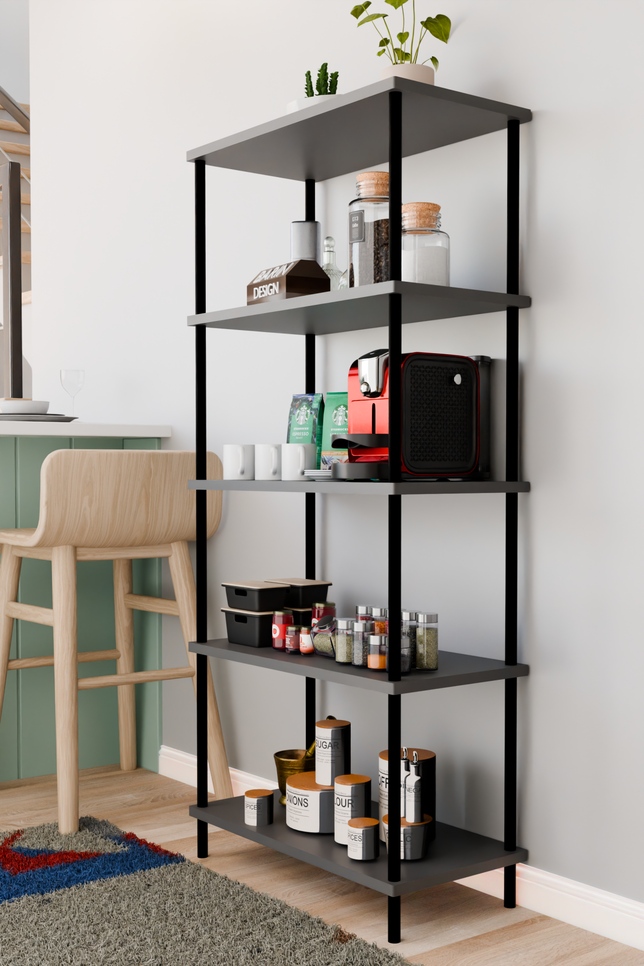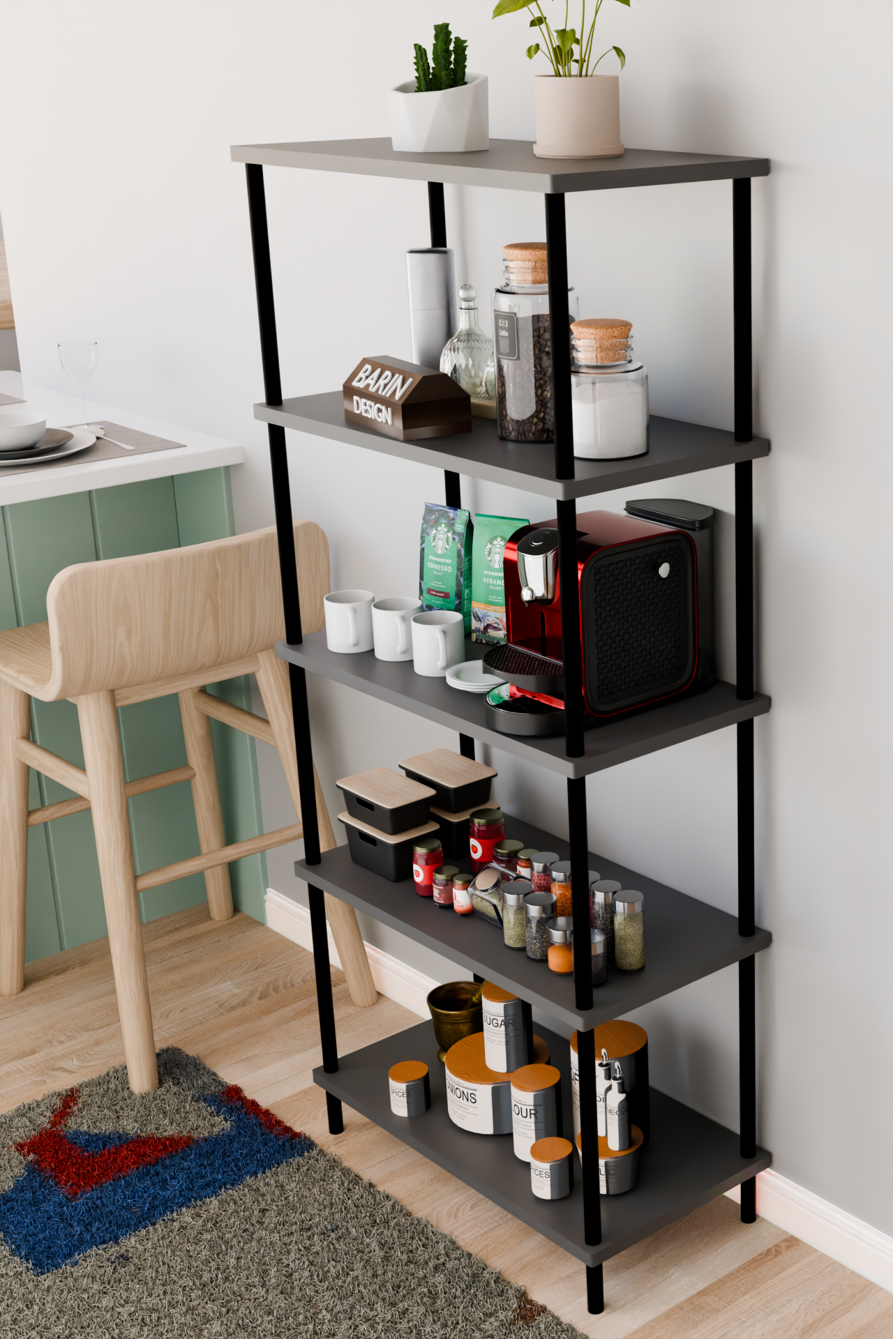 5 Raflı Çevir Kur Çok Amaçlı Raf Mutfak, Kiler, Ofis, Depo Kullanımına Uygun Açık Raflı Düzenleyici Antrasit