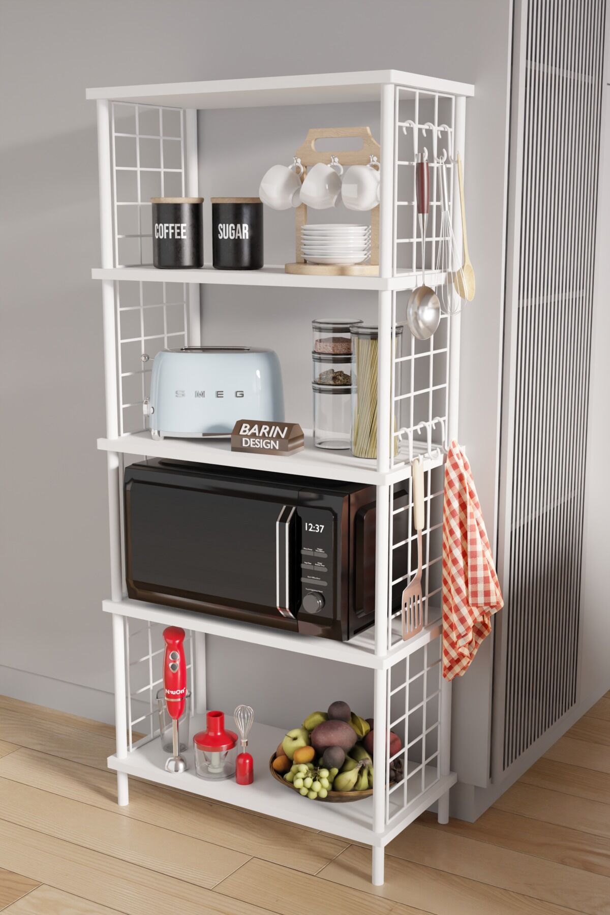 - Sağlam metal gövde ve dayanıklı raflar