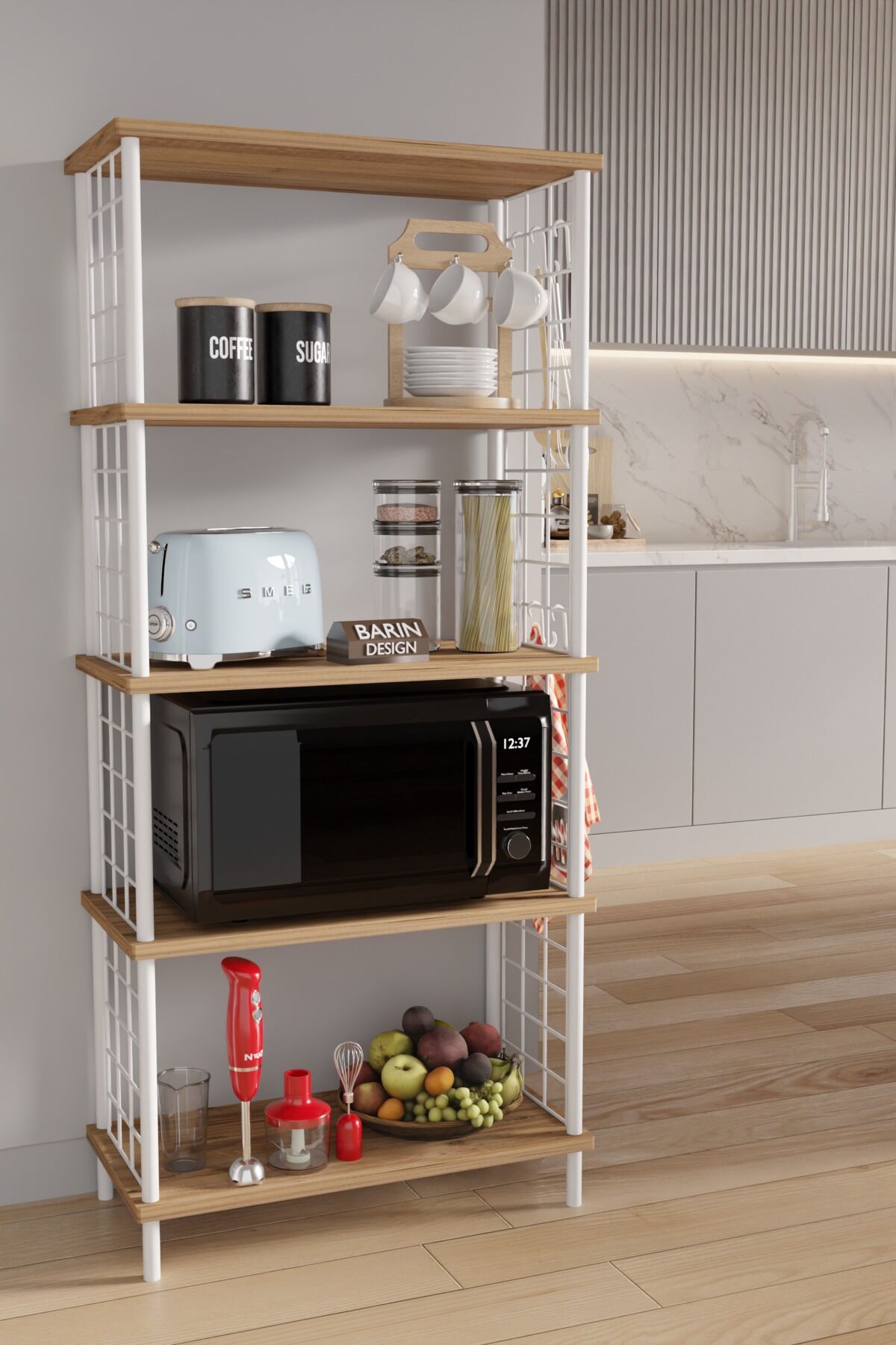 Barın Design 5 Raflı Raf Ünitesi, evinizin her alanında fonksiyonel kullanım sunar. Kolay kurulum sağlayan ÇEVİR-KUR sistemi ile alet gerektirmeden monte edilir. Şık görünümüyle dekoratif bütünlüğü tamamlar, dayanıklı yapısıyla uzun ömürlü kullanım sağlar.