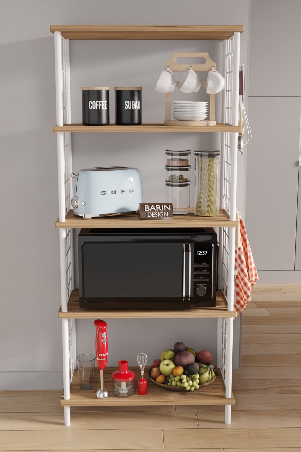 - Sağlam metal gövde ve dayanıklı raflar