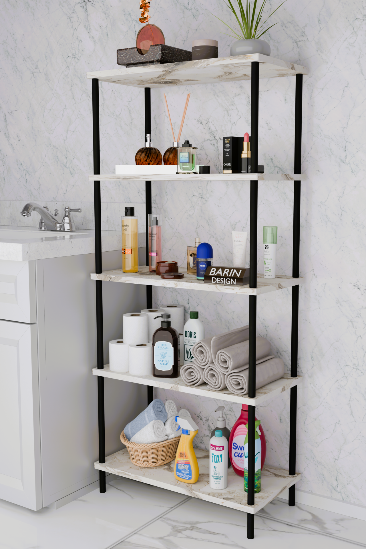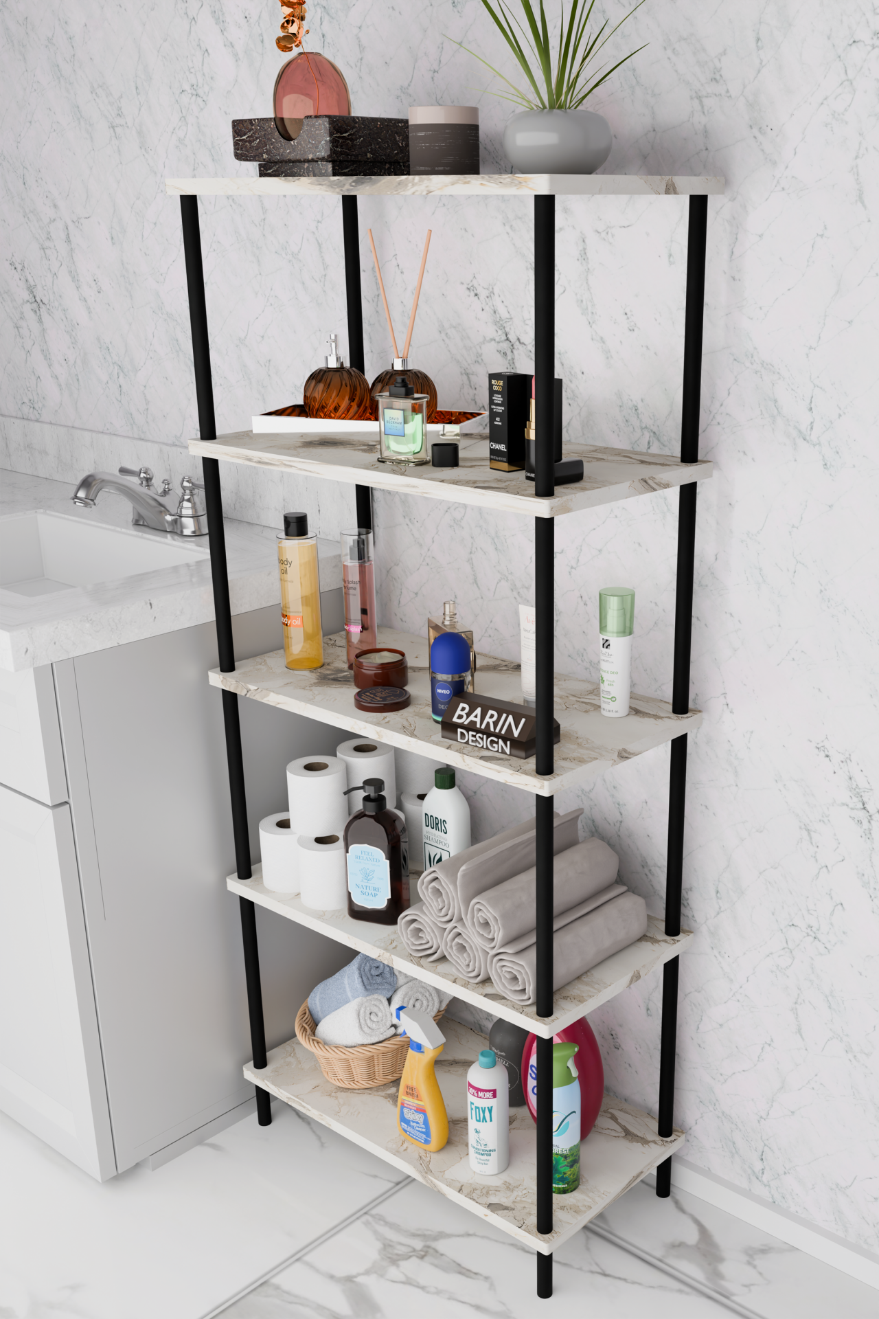 5 Raflı Çevir-Kur Raf Ünitesi | Çok Amaçlı Düzenleyici | Kolay Kurulum Banyo Mutfak Ofis Uyumlu Raf Beyaz Mermer