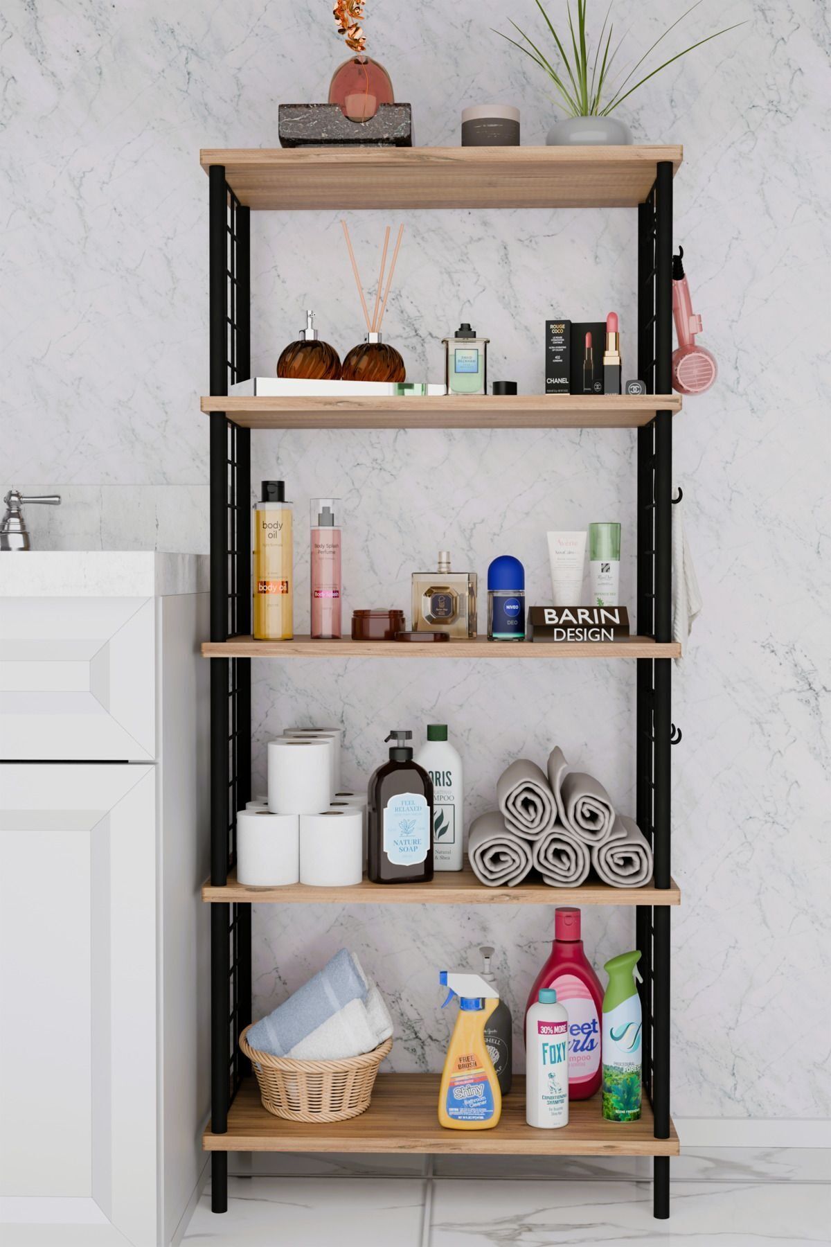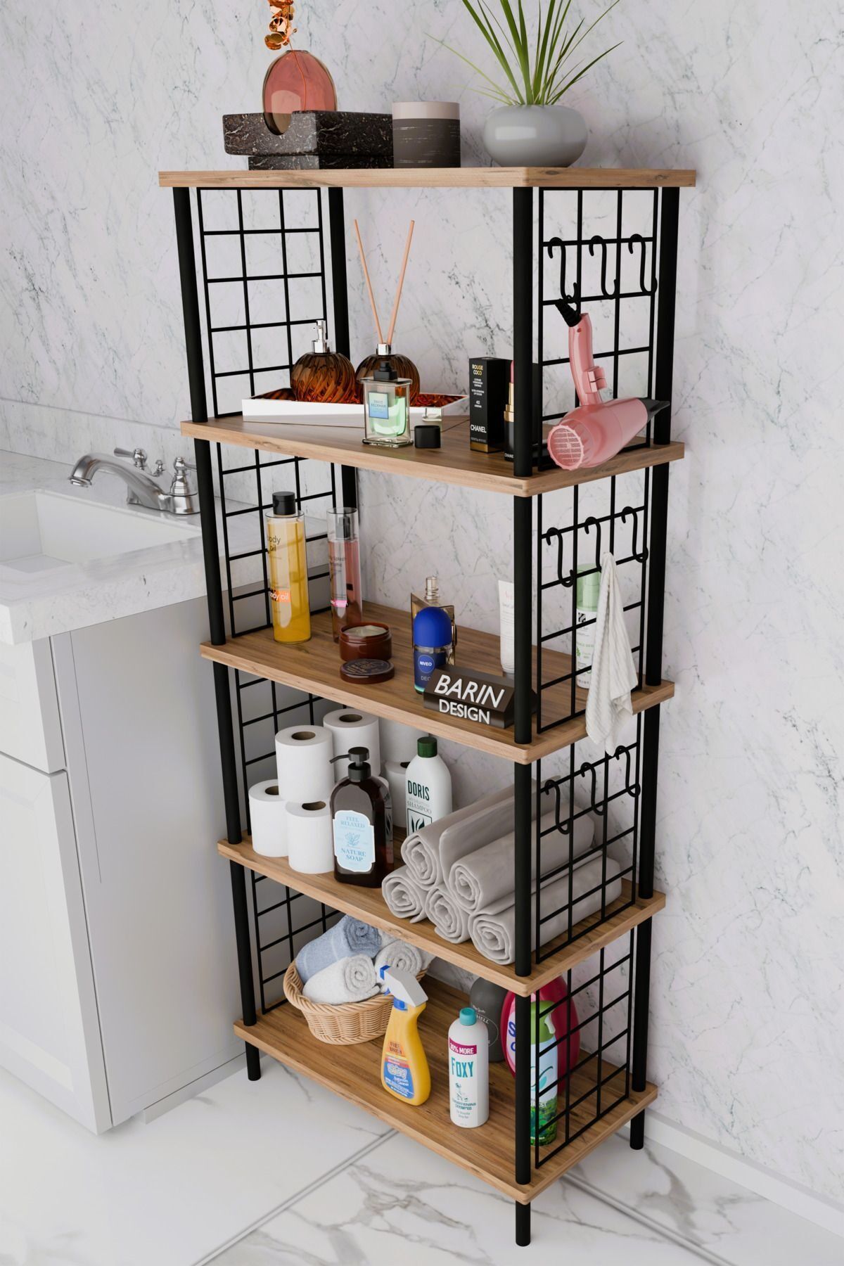 5 Raflı Çevir-Kur Raf Ünitesi | Telli Metal Gövdeli Organizer | Banyo, Mutfak, Balkon, Antre Uyumlu Atlantik Çam