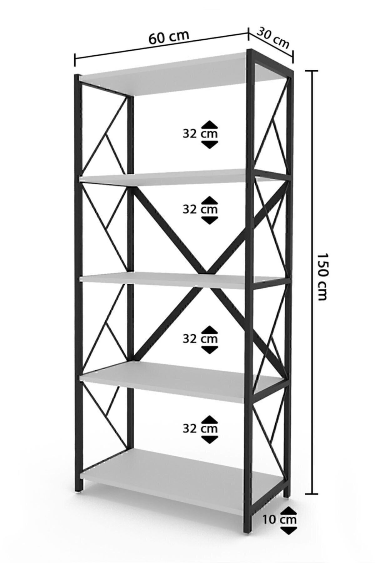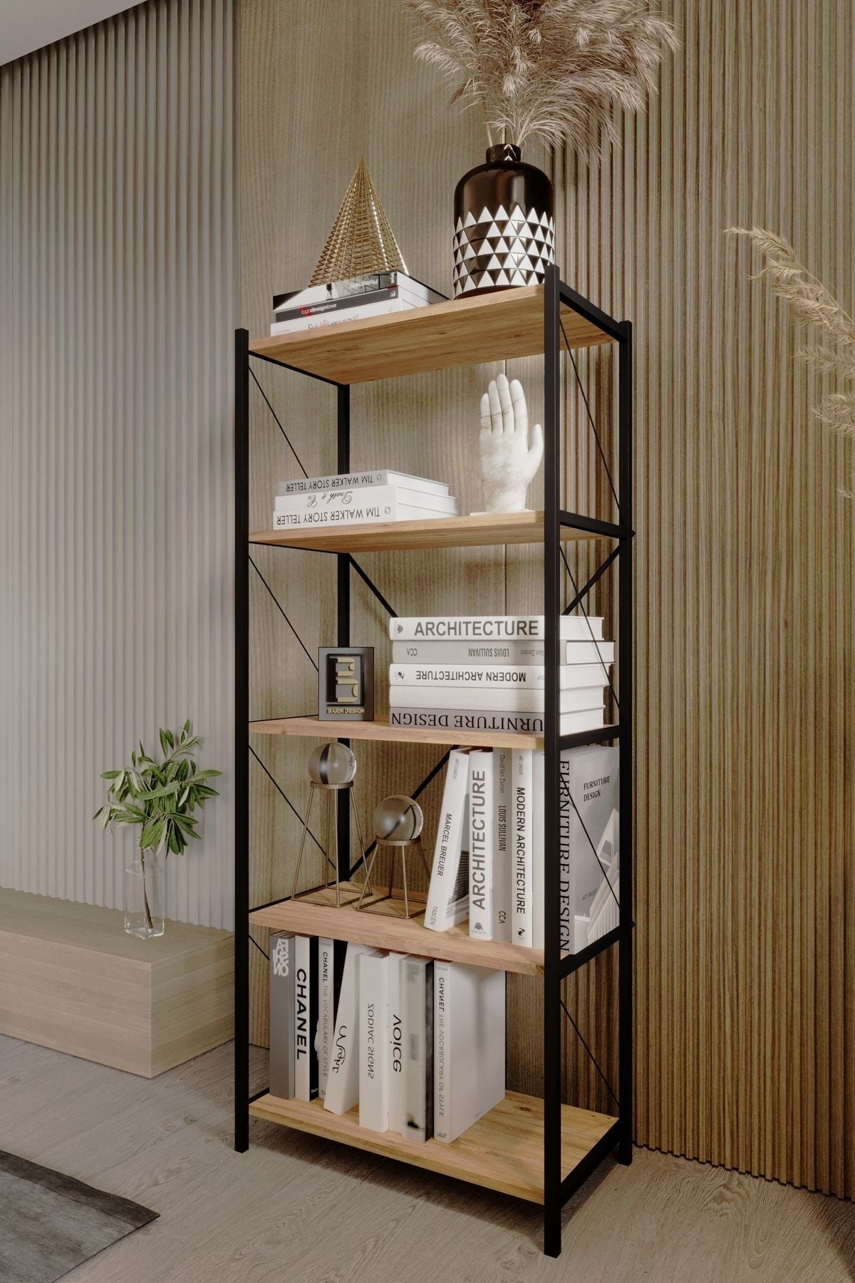 5 Raflı Kitaplık Demir Profil Modern İskandinav Çalışma Odası Ofis Salon Kitaplığı Evrak Rafı Metal Atlantik Çam
