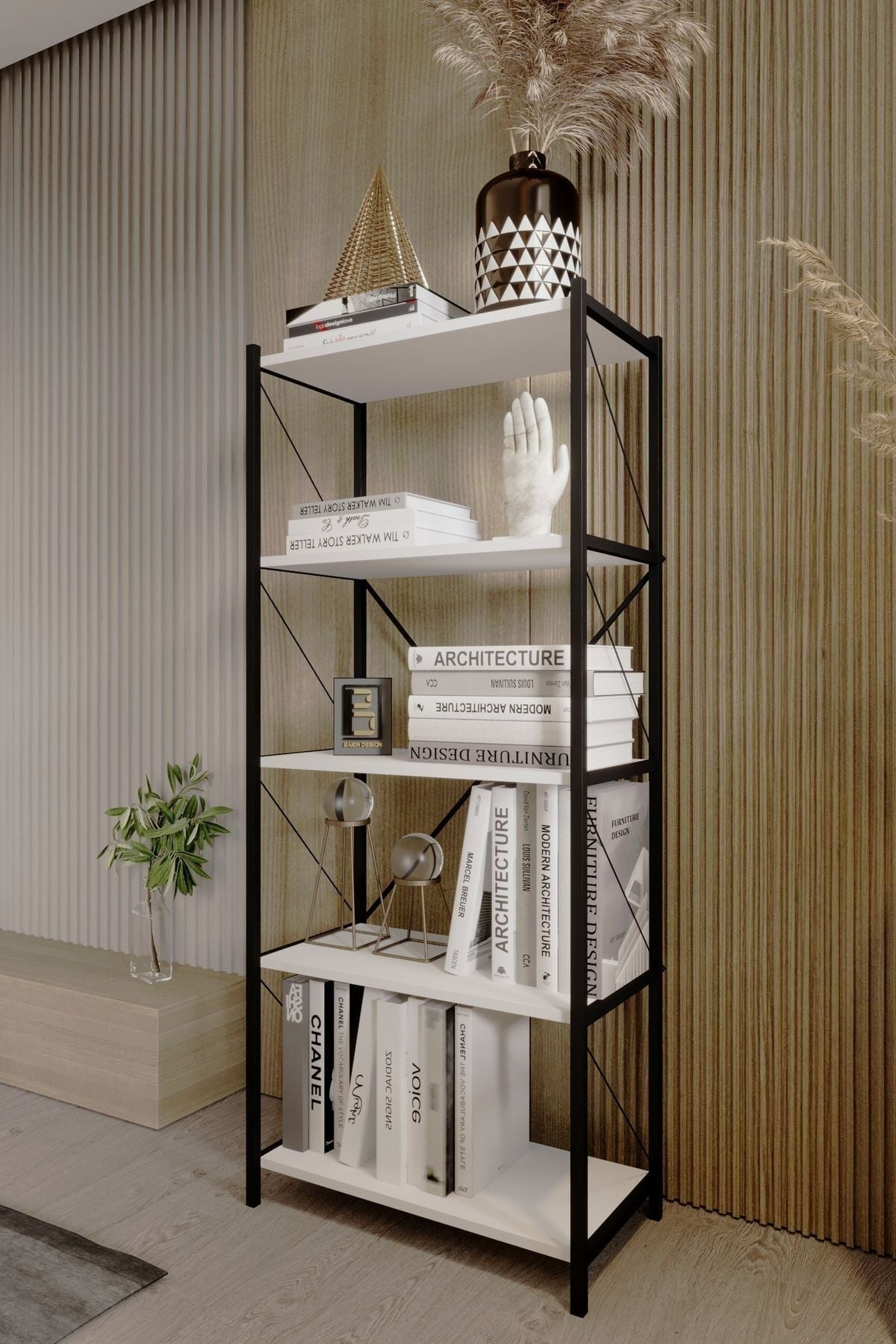 5 Raflı Kitaplık Demir Profil Modern İskandinav Çalışma Odası Ofis Salon Kitaplığı Evrak Rafı Metal Beyaz