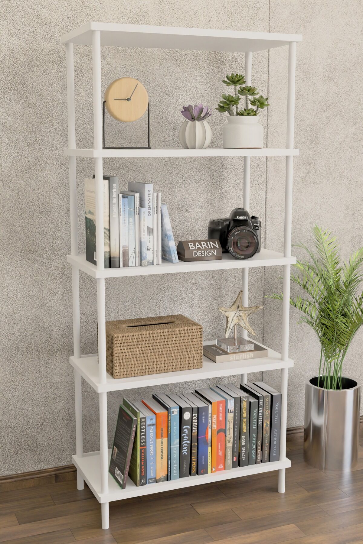 Barın Design 5 Raflı Raf Ünitesi, evinizin her alanında fonksiyonel kullanım sunar. Kolay kurulum sağlayan ÇEVİR-KUR sistemi ile alet gerektirmeden monte edilir. Şık görünümüyle dekoratif bütünlüğü tamamlar, dayanıklı yapısıyla uzun ömürlü kullanım sağlar.