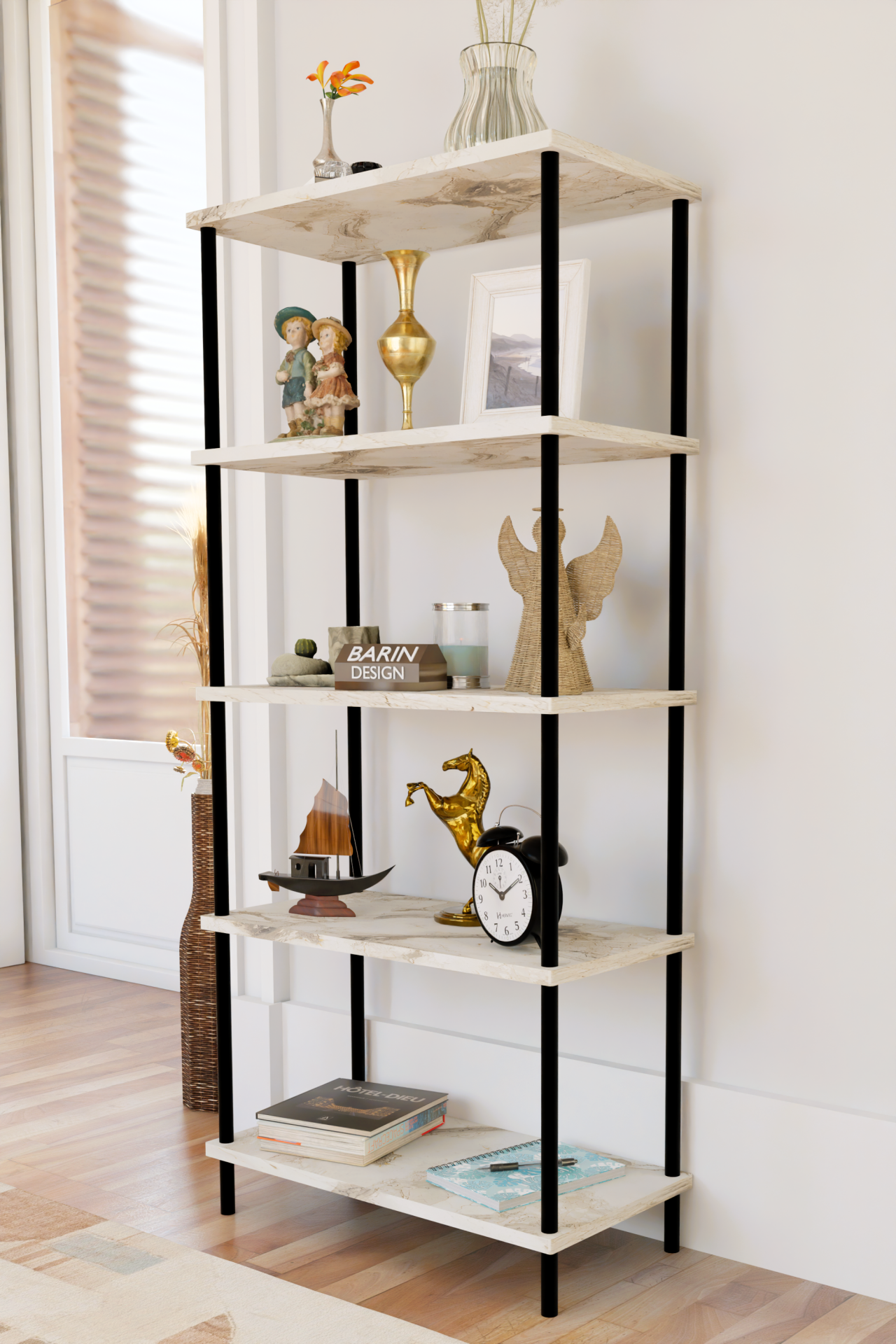 5 Raflı Modern Metal Gövdeli Kitaplık Çevir-Tak Kolay Kurulum Çalışma Odası, Salon, Ofis Kullanımı Beyaz Mermer