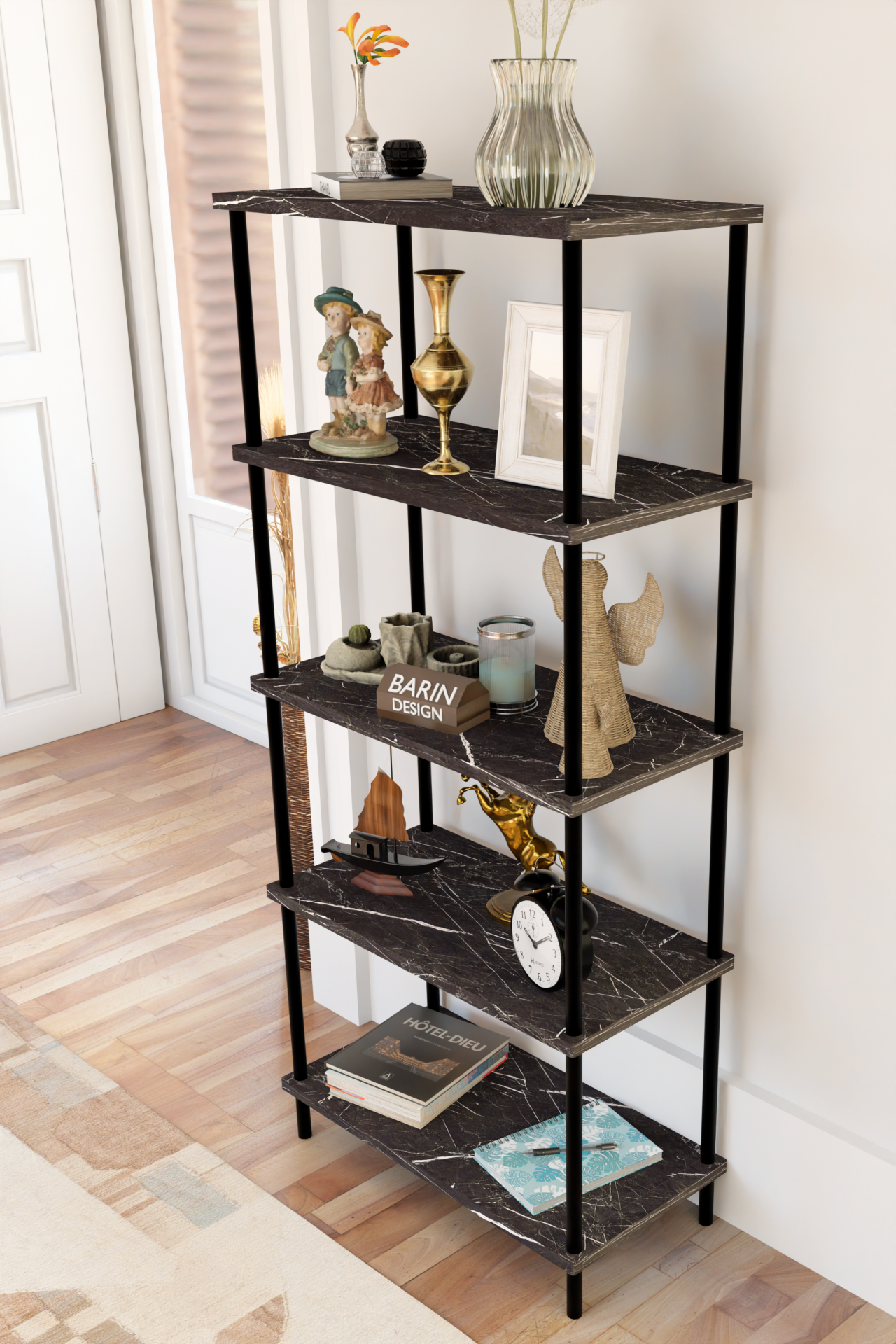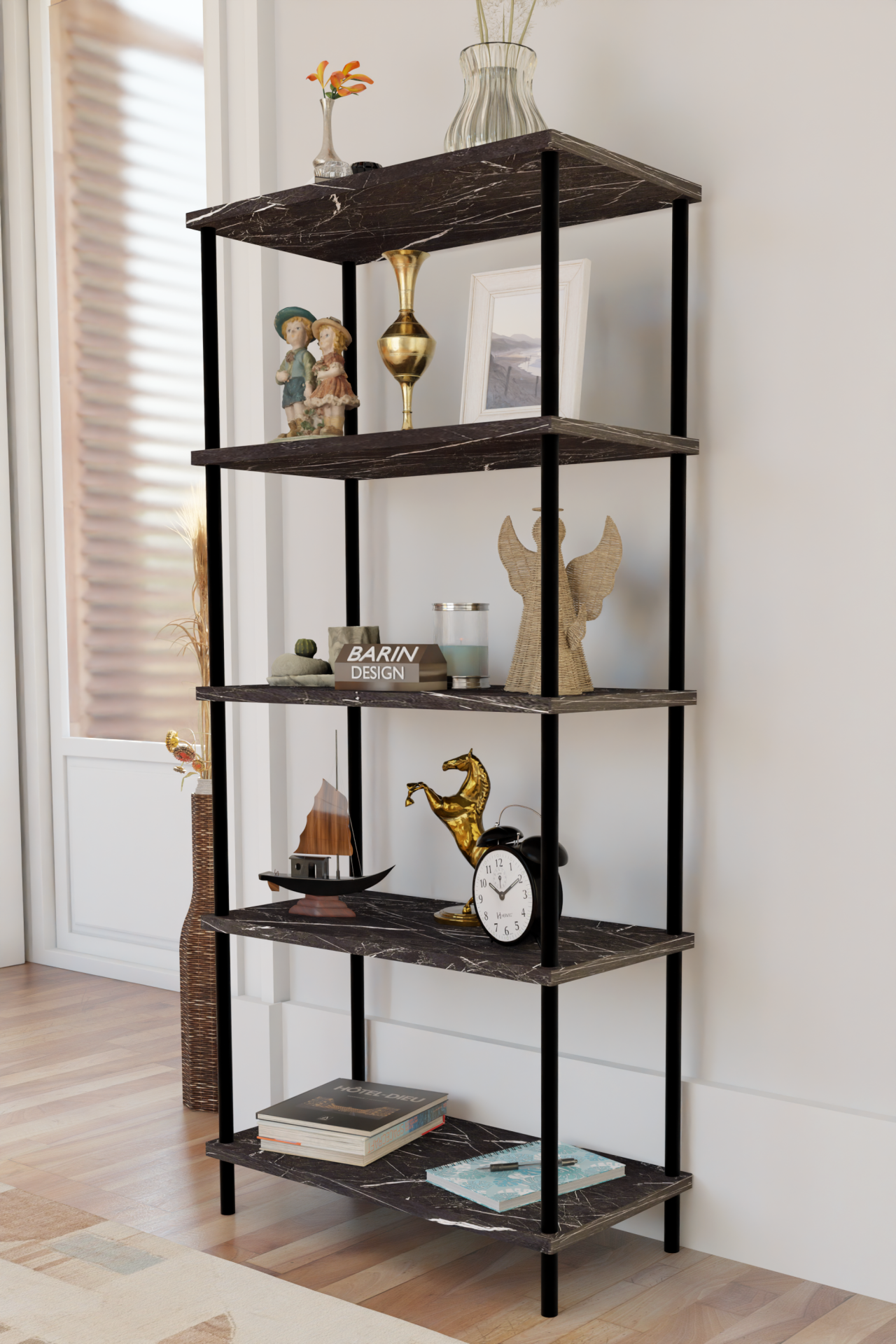5 Raflı Modern Metal Gövdeli Kitaplık Çevir-Tak Kolay Kurulum Çalışma Odası, Salon, Ofis Kullanımı Siyah Mermer
