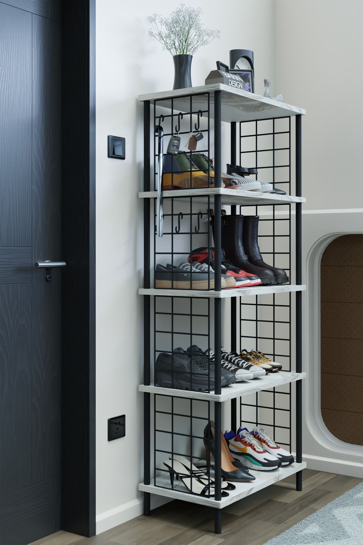 5 Raflı Telli Çevir Kur Çok Amaçlı Ayakkabılık ve Düzenleyici Raf Ünitesi Antre, Banyo, Balkon, Ofis Beyaz Mermer
