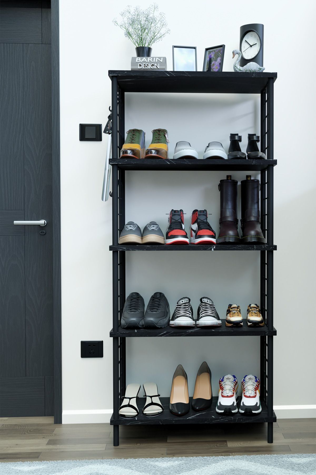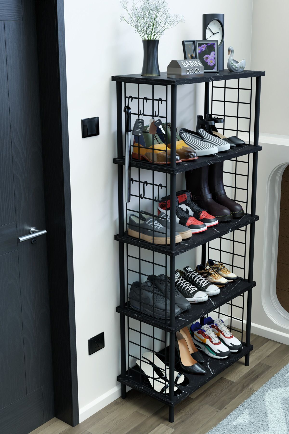5 Raflı Telli Çevir Kur Çok Amaçlı Ayakkabılık ve Düzenleyici Raf Ünitesi Antre, Banyo, Balkon, Ofis Siyah Mermer