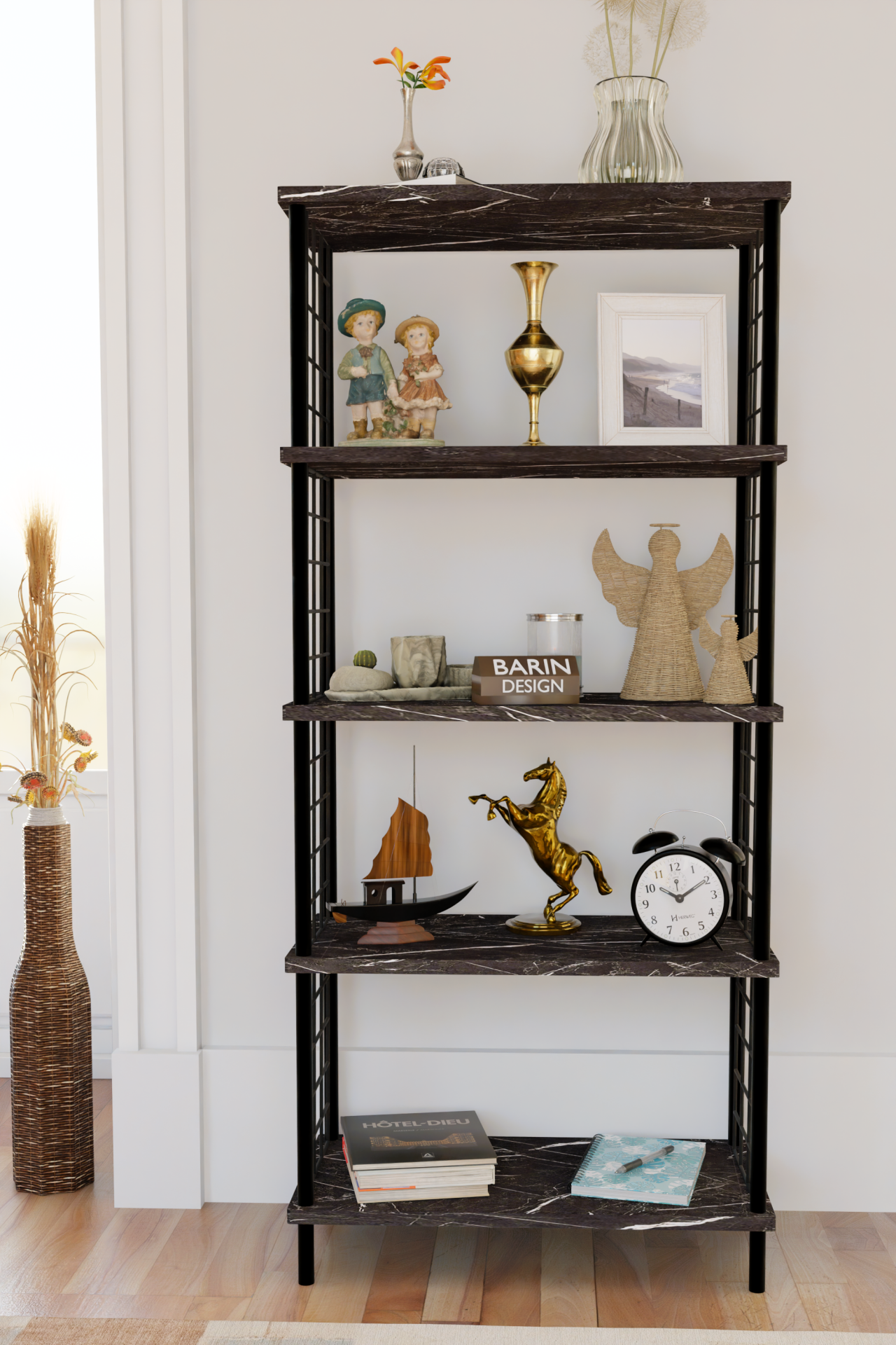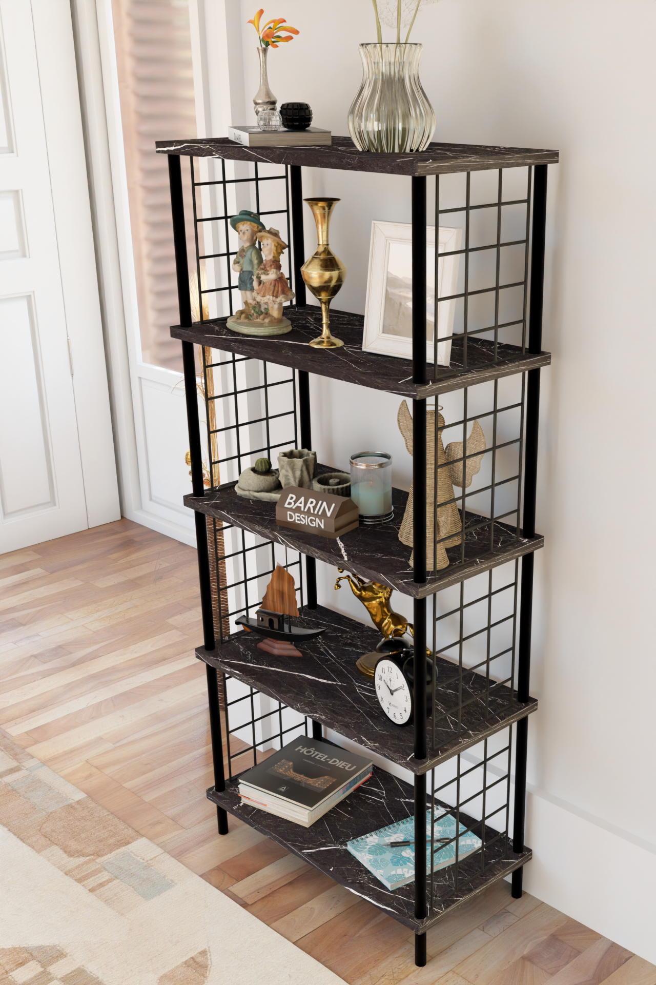 5 Raflı Telli Metal Kitaplık Salon,Ofis,Çalışma Odası Modern Düzenleyici Çevir Tak Kolay Kurulum Raf Siyah Mermer