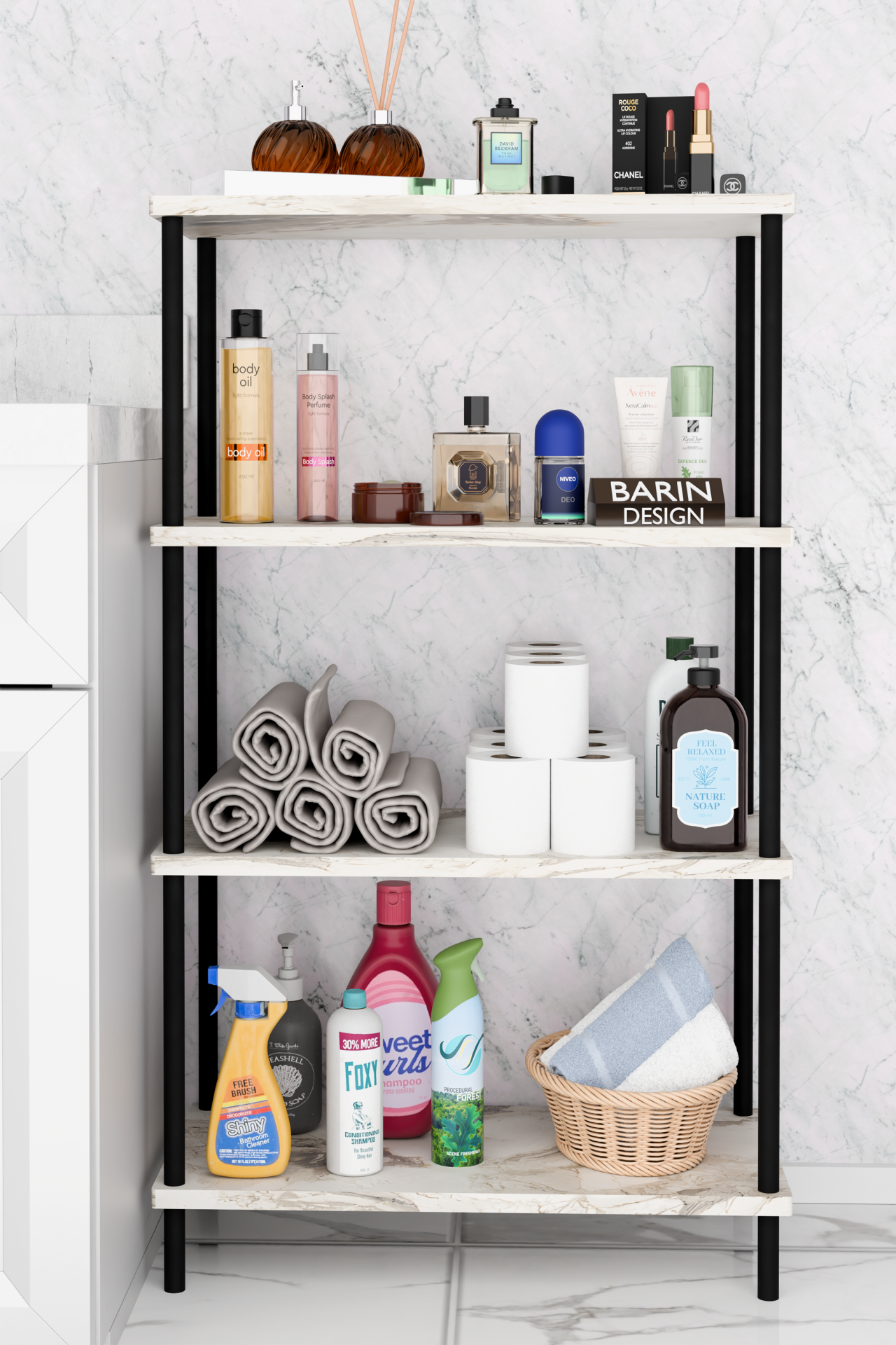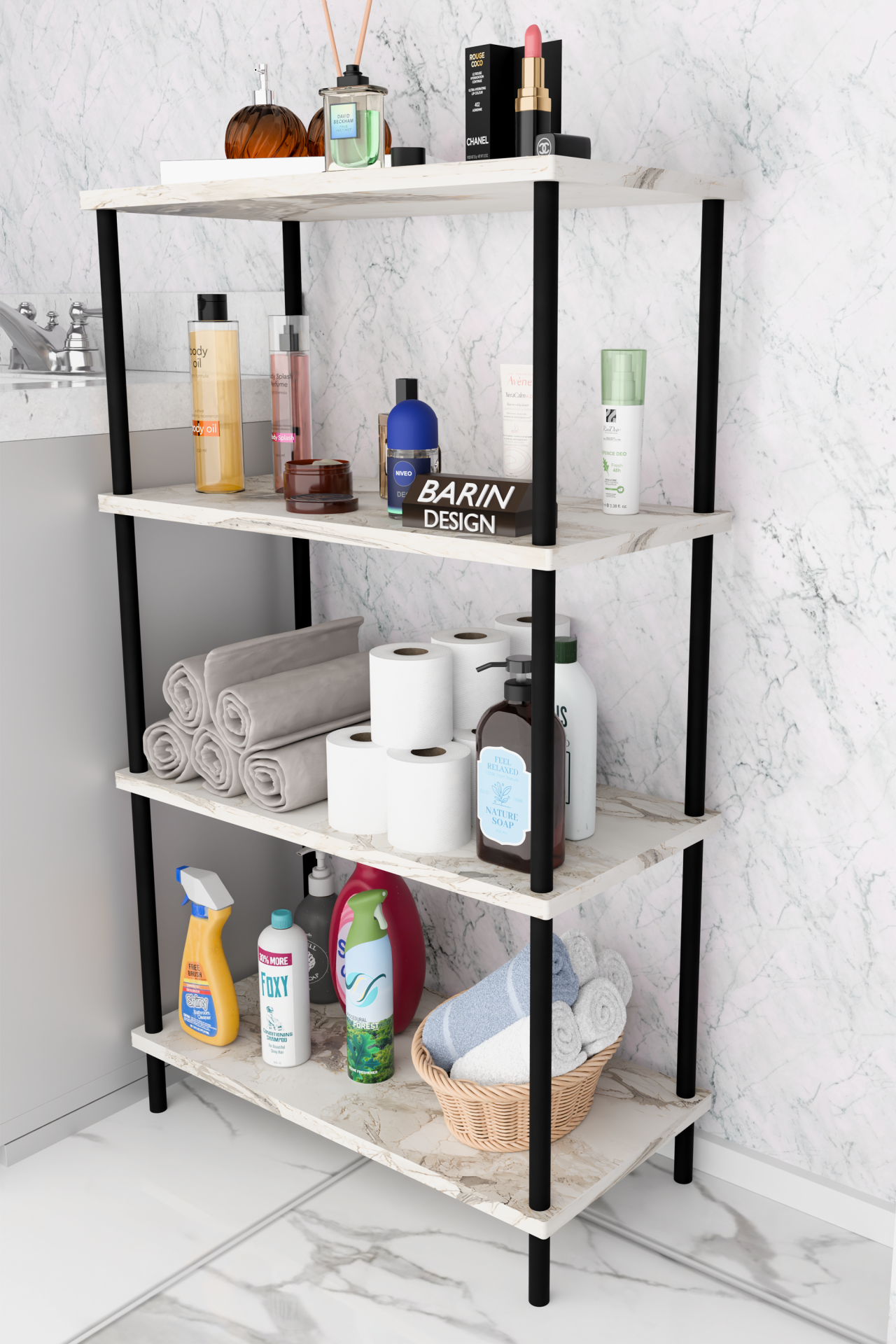 Çevir Kur Kolay Kurulum 4 Katlı Banyo Rafı | Metal Gövdeli Çok Amaçlı Organizer Stand Banyo Dolabı Beyaz Mermer