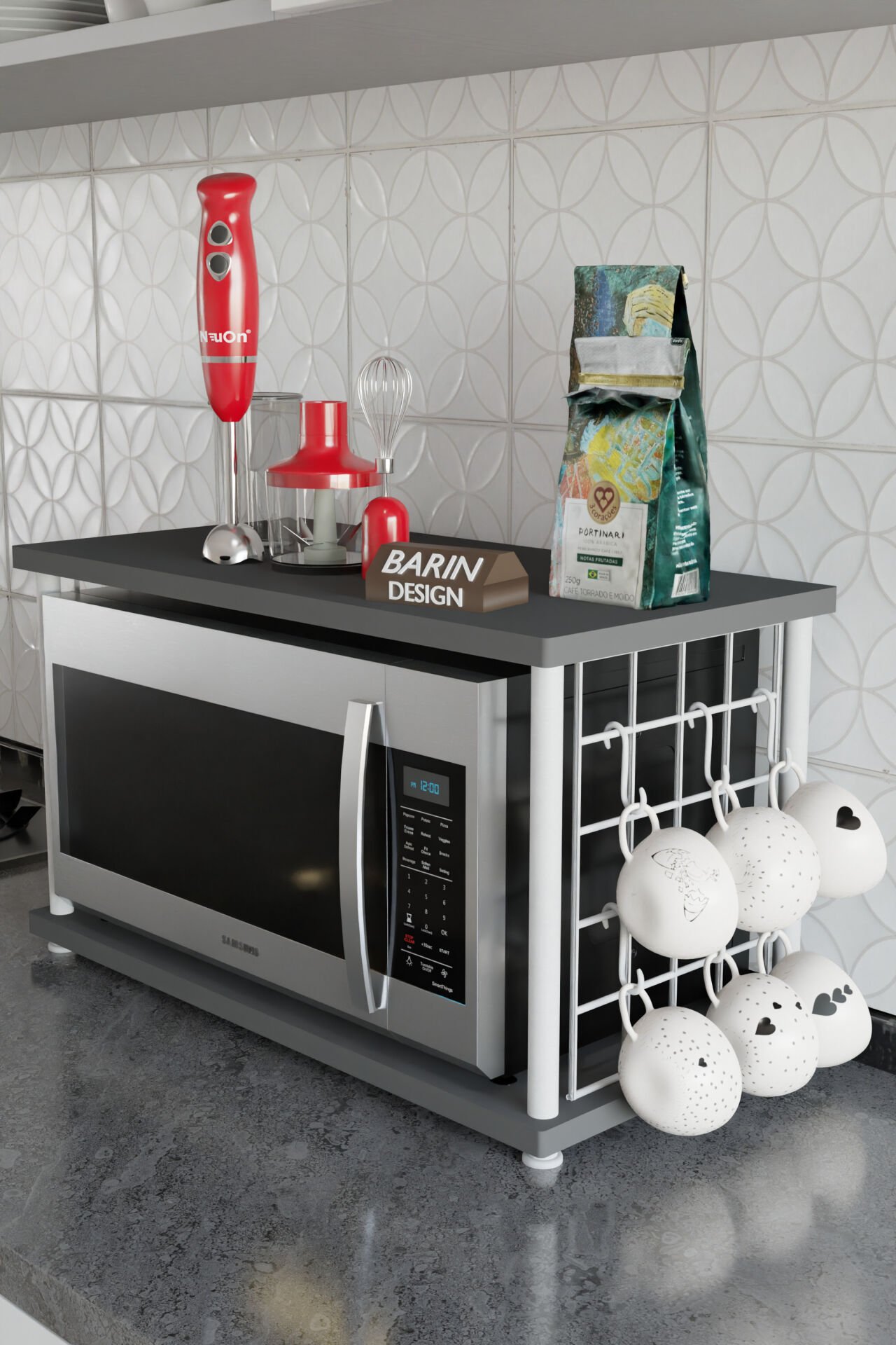 Mutfakta yer kazanmak isteyenler için özel olarak tasarlanan bardak askılı mikrodalga fırın üstü raf, hem şık görünümü hem de fonksiyonelliğiyle mutfağınıza pratiklik kazandırır. Dayanıklı metal iskeleti ve sağlam üst tablasıyla uzun ömürlü kullanım sunar.