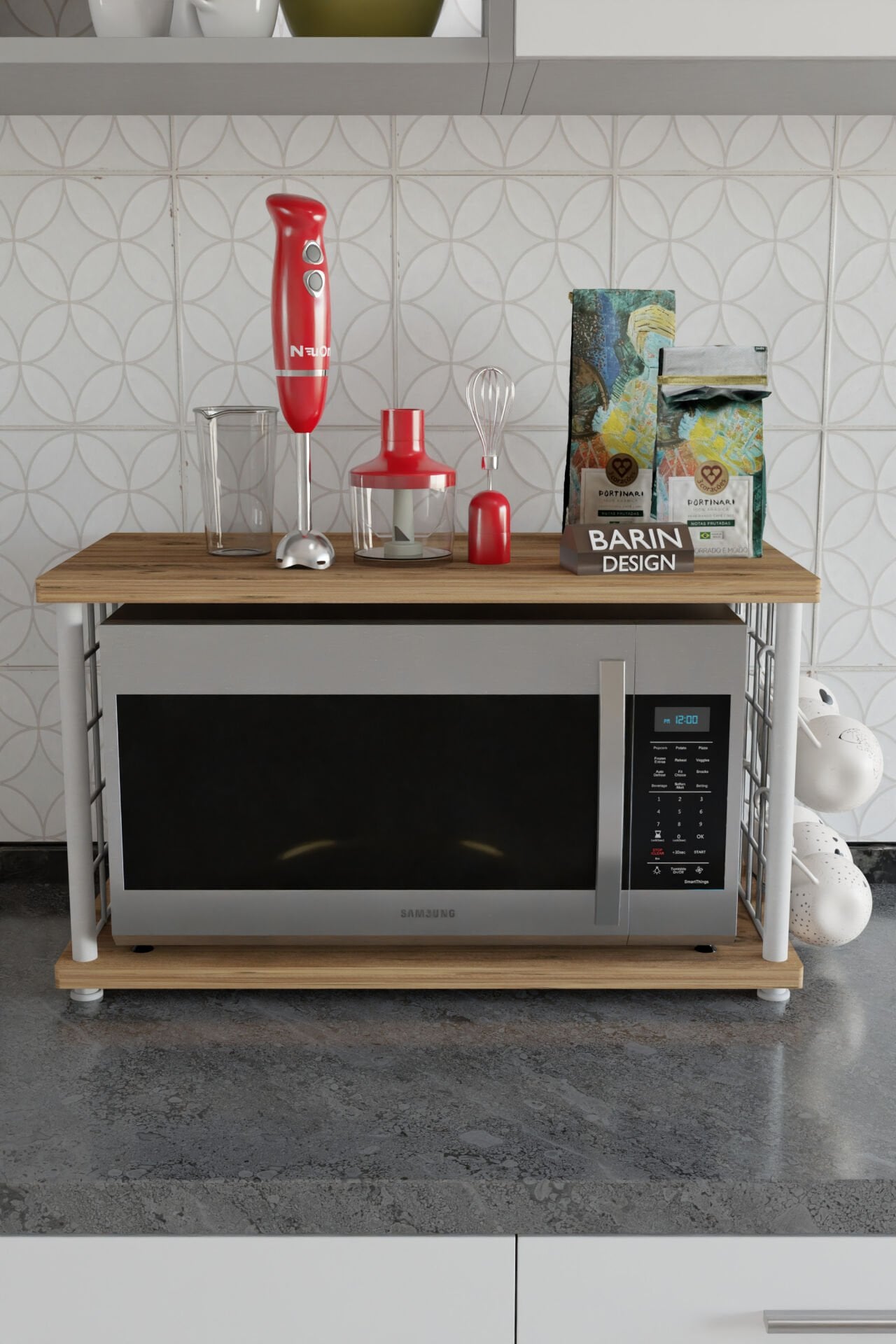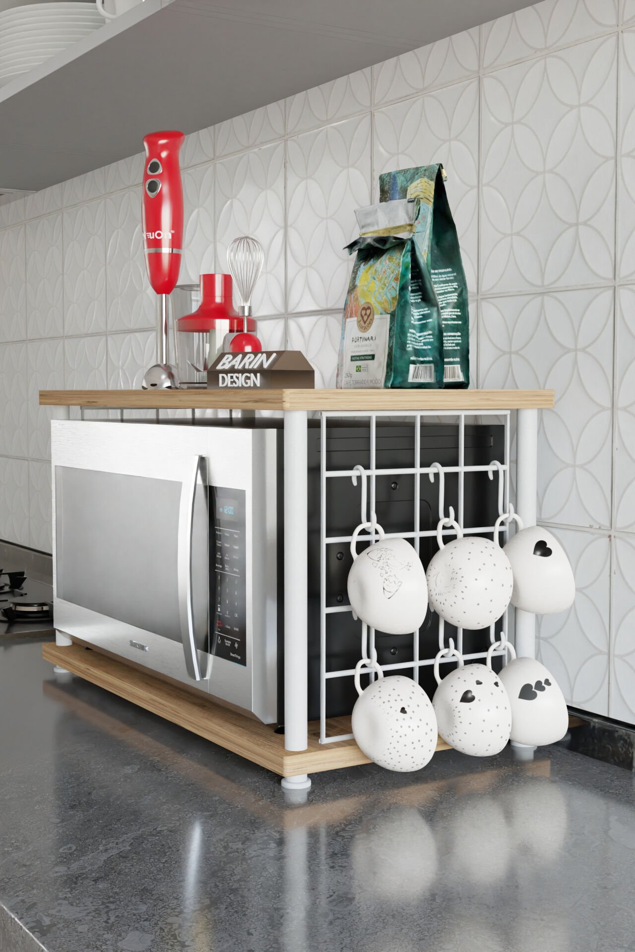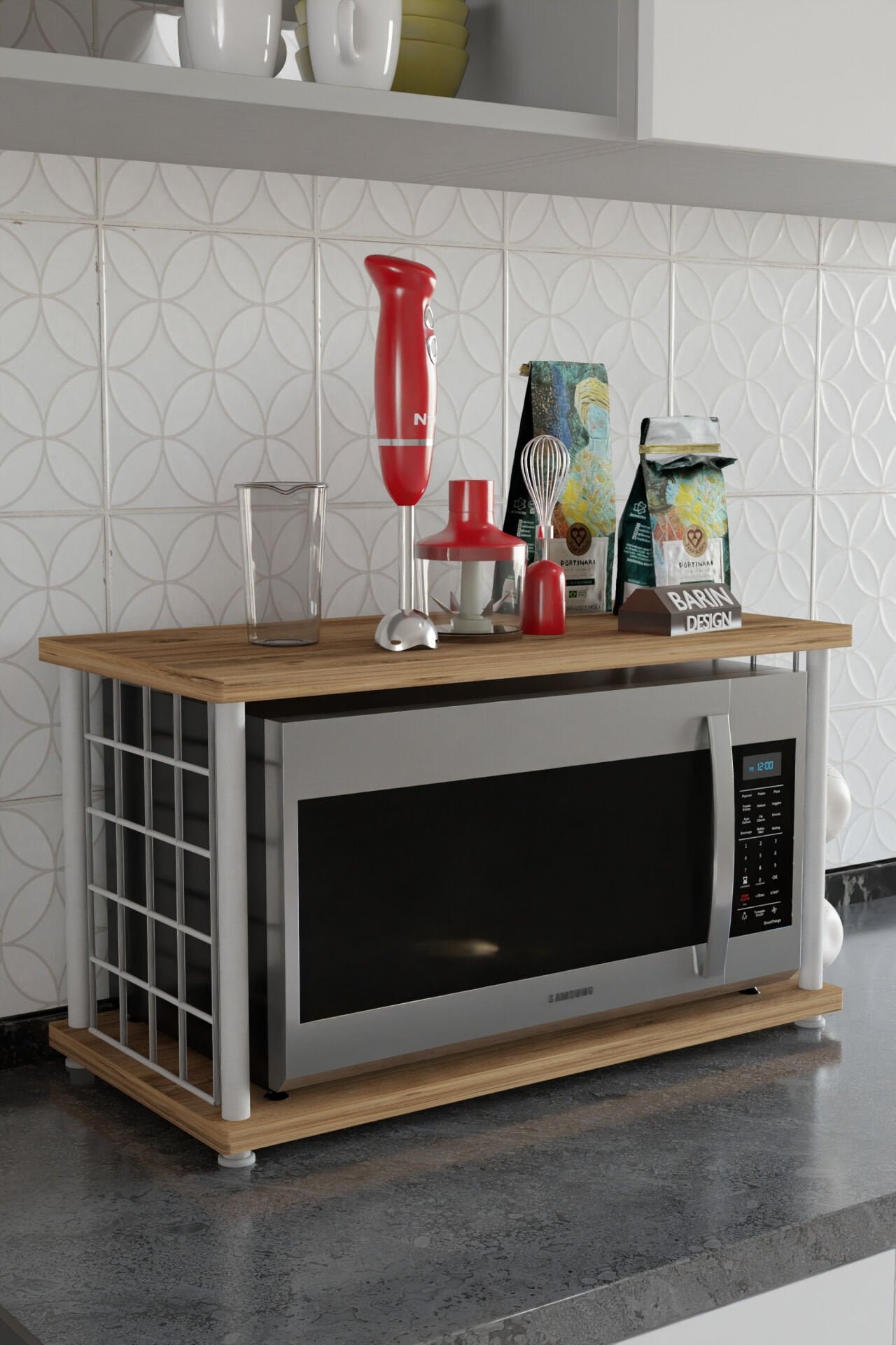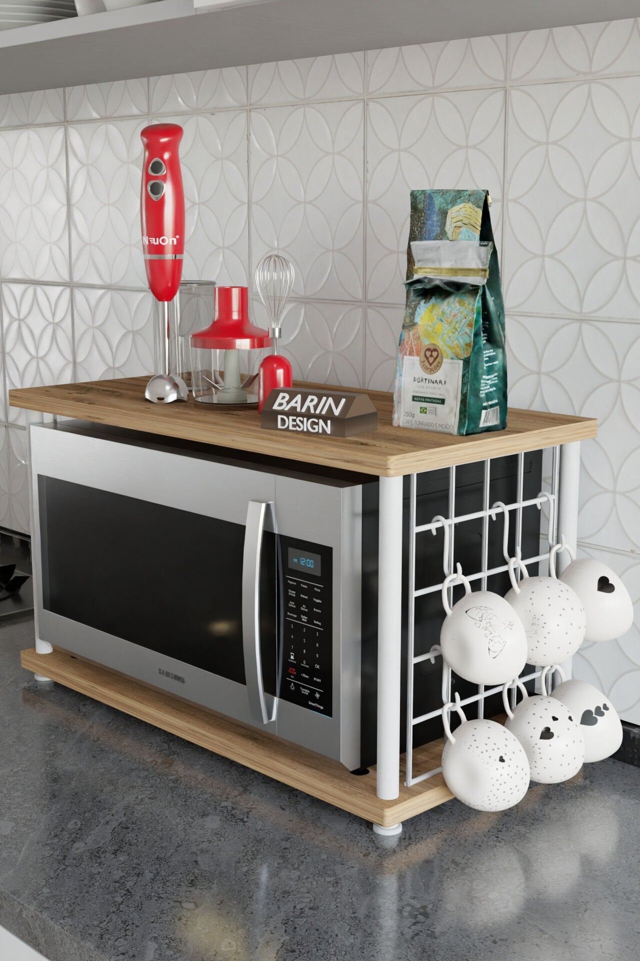 Mutfakta yer kazanmak isteyenler için özel olarak tasarlanan bardak askılı mikrodalga fırın üstü raf, hem şık görünümü hem de fonksiyonelliğiyle mutfağınıza pratiklik kazandırır. Dayanıklı metal iskeleti ve sağlam üst tablasıyla uzun ömürlü kullanım sunar.