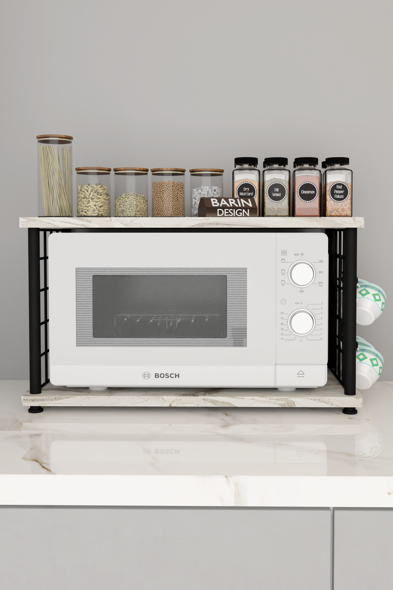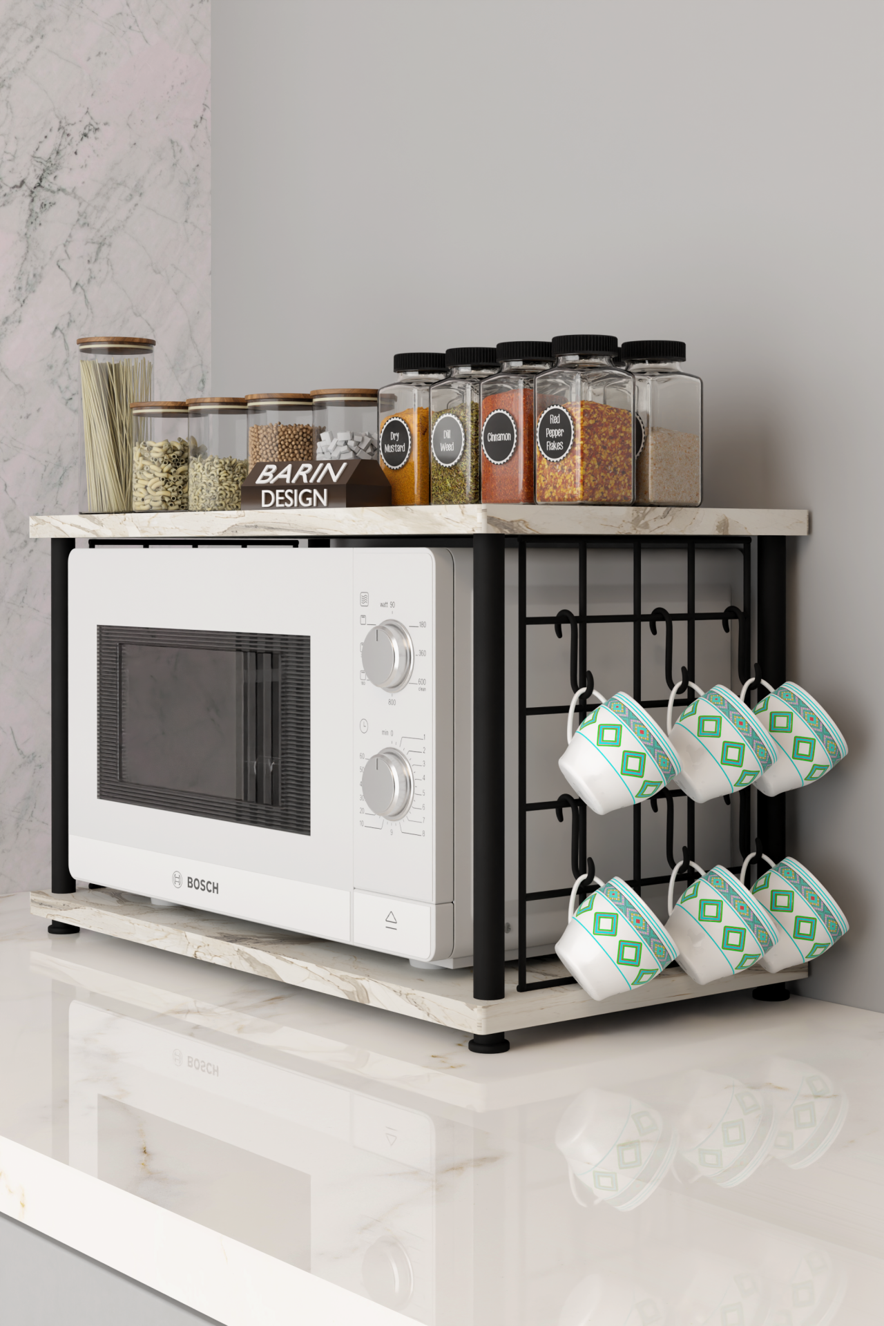 Çevir Kur Metal Telli Mikrodalga Üstü Raf Baharatlık Askılı Çok Amaçlı Mutfak Organizer Beyaz Mermer
