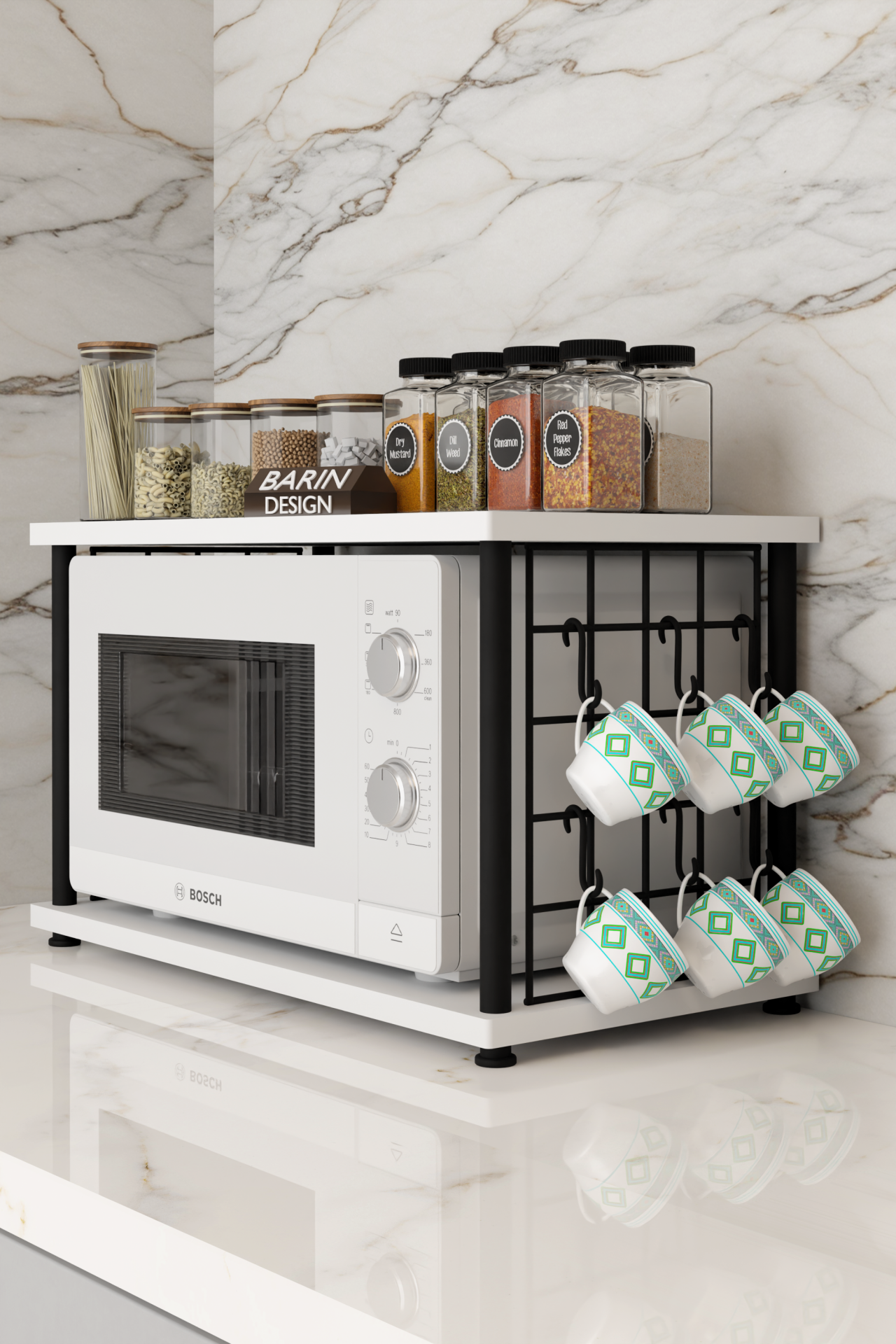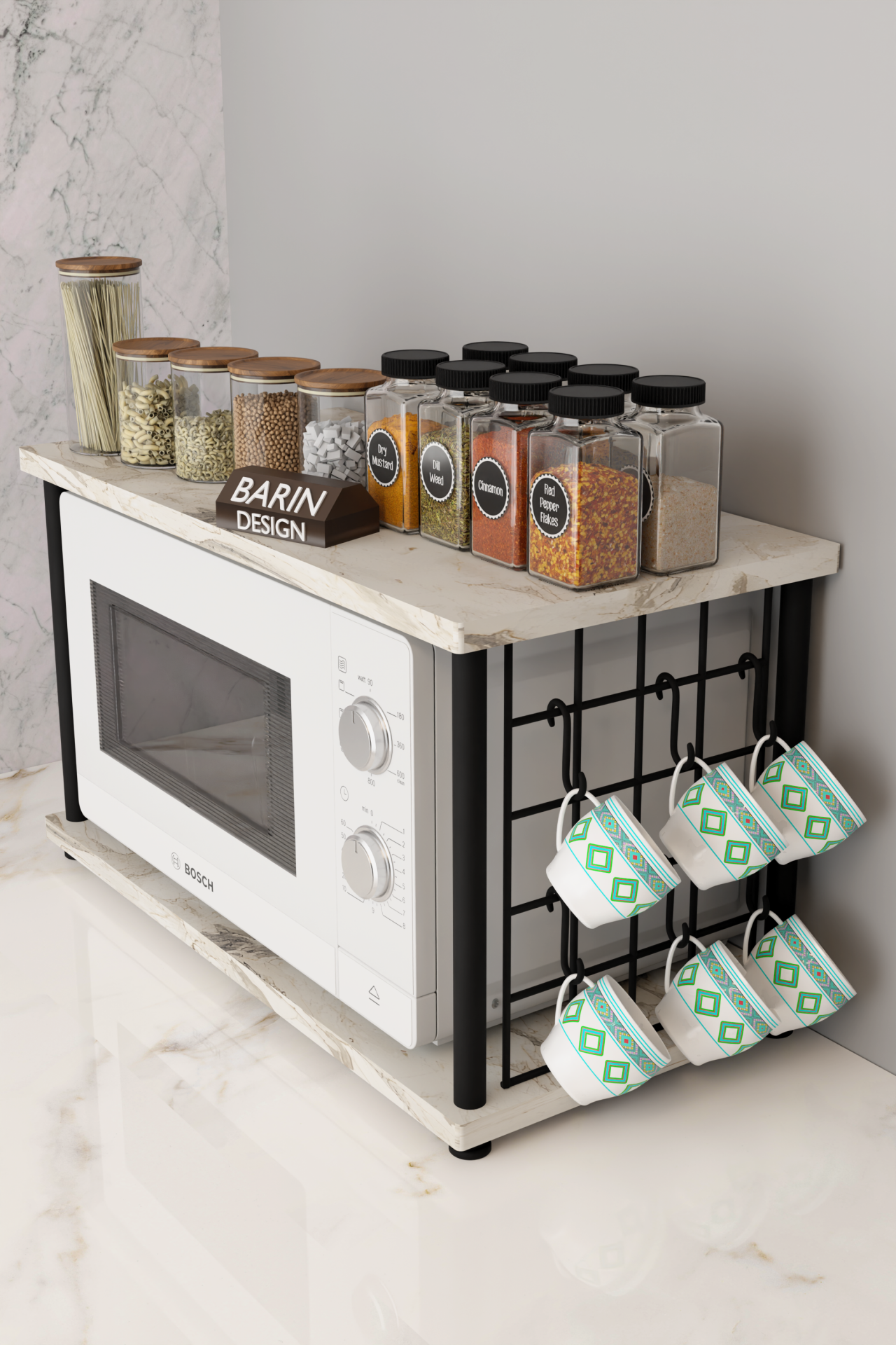 Çevir Kur Metal Telli Mikrodalga Üstü Raf Baharatlık Askılı Çok Amaçlı Mutfak Organizer Siyah Mermer