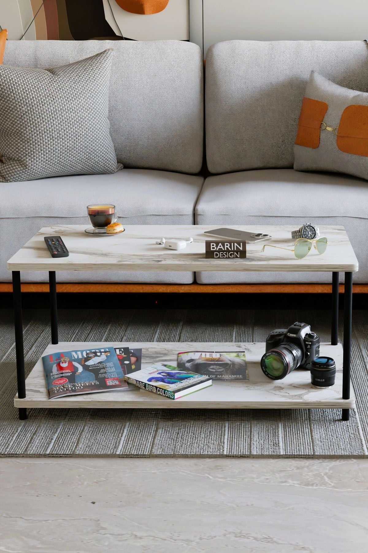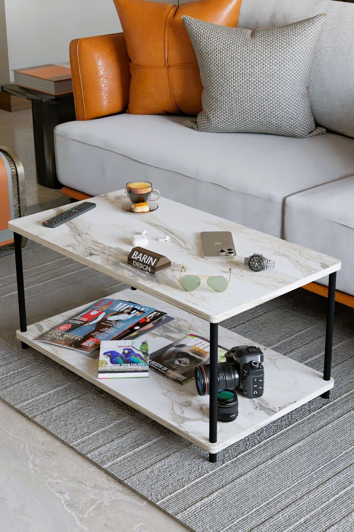 Çevir Tak Dikdörtgen Orta Sehpa 2 Raflı Salon ve Ofis Dekorasyonunda Tamamlayıcı Dekoratif Şık Sehpa Beyaz Mermer